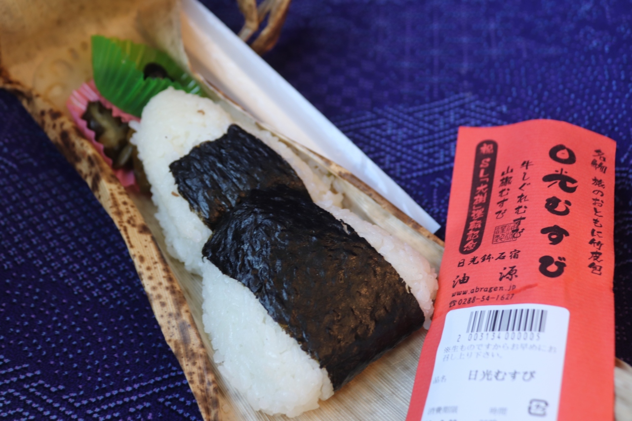 鬼怒川温泉駅構内の売店で駅弁を扱っています。休日は観光客でにぎわいます。気軽に車内で食べられるように「日光むすび」をいただきました。牛しぐれ、山椒がはいったおにぎりがふたつ、ハイキングのお伴にもお勧めです。