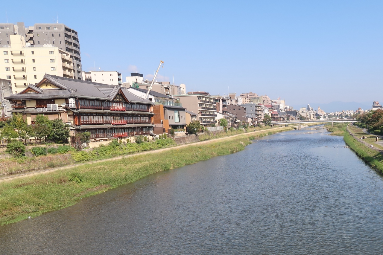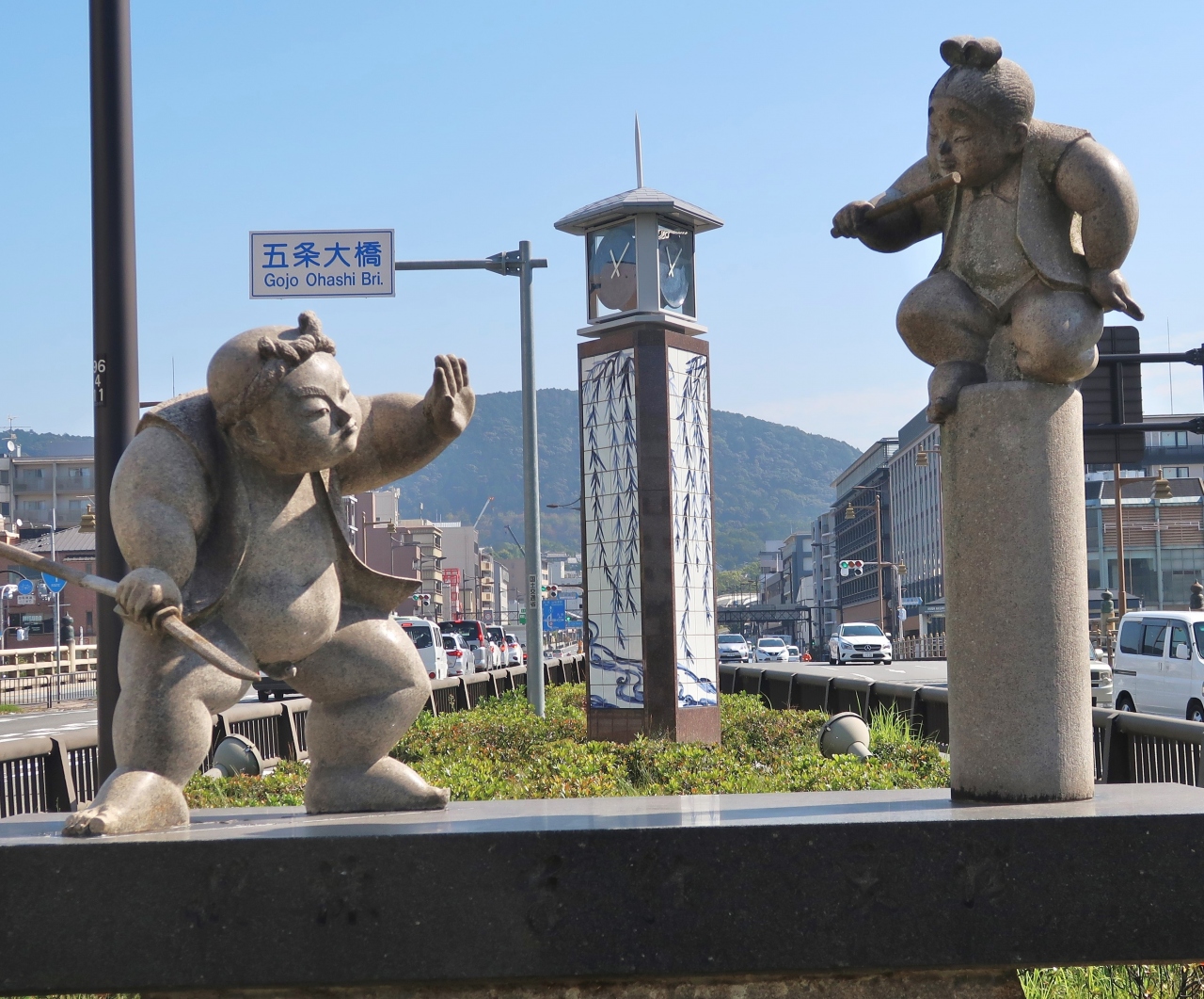朝食後、横断歩道を渡って、五条大橋の西側の中央分離帯に置かれている牛若丸と弁慶の像を見に行きました。欄干の上に飛びあがった牛若丸、薙刀を持って「やあ」と挨拶する弁慶ともに、むちむちの幼児体型でした。歴史上の義経と弁慶の出会いの場となった五条大橋は、上流側に架かっている現在の松原橋のことだそうです。