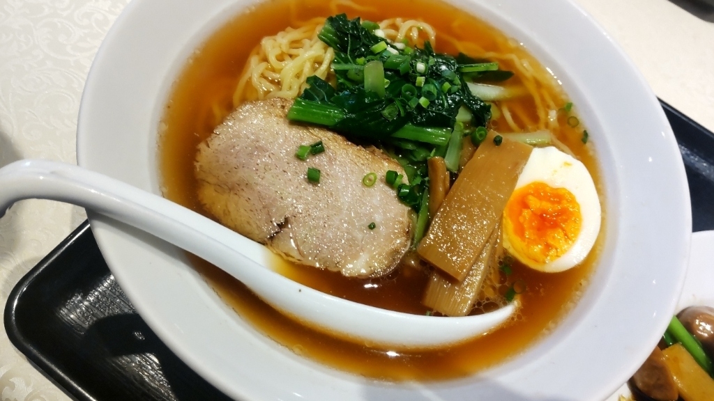 ラーメンはシンプルな醤油ラーメンで、具はチャーシュー、メンマ、ほうれん草に卵。