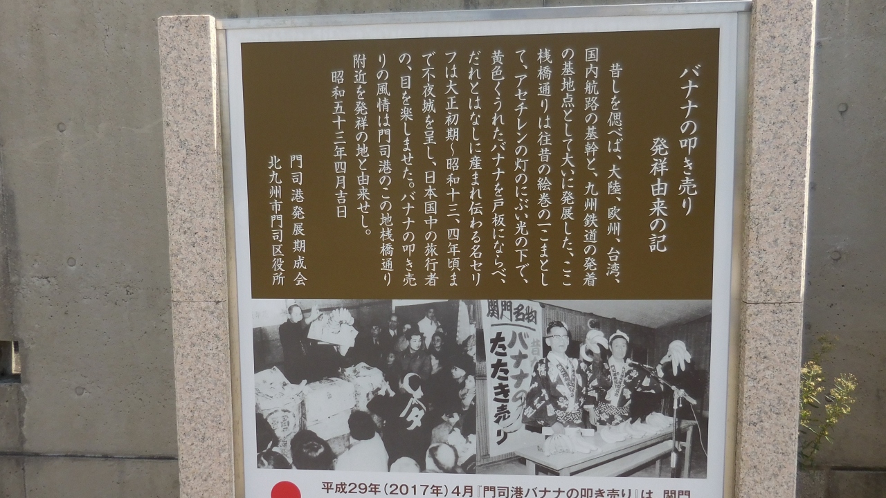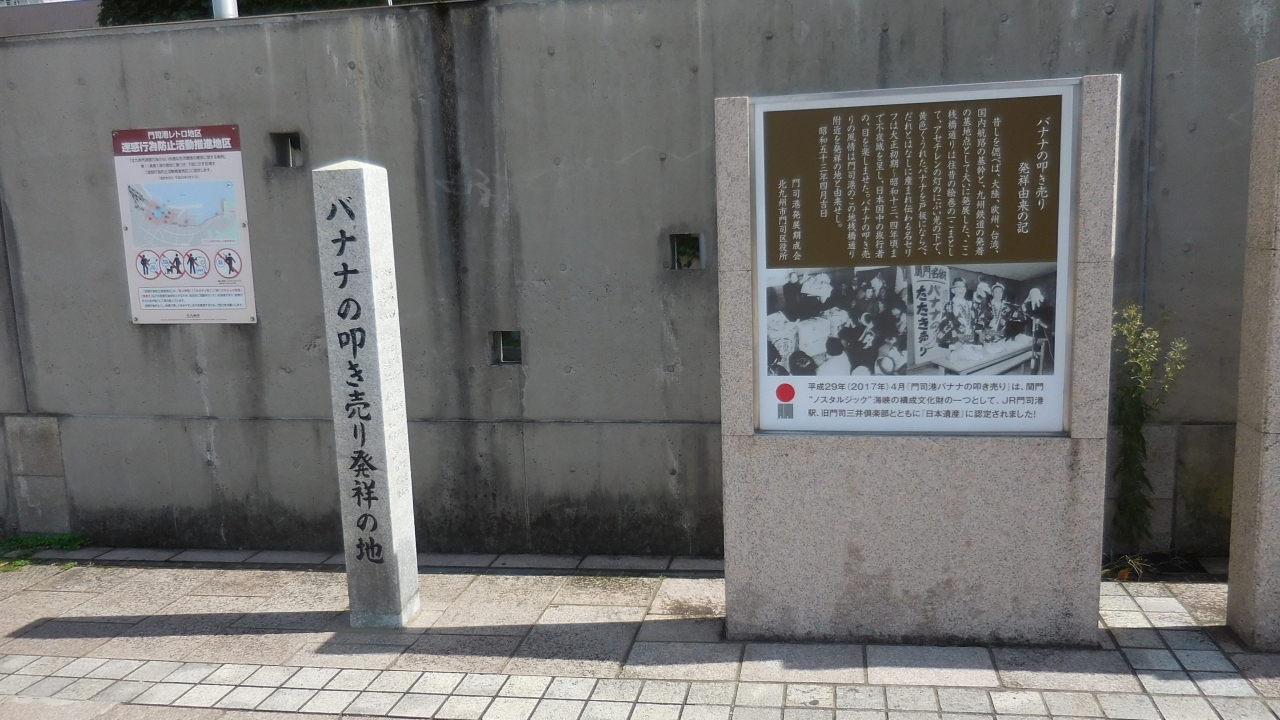門司港駅前広場の一隅に「バナナの叩き売り発祥の地」の記念碑が建っている。説明板によると大正初期から昭和13、14年頃まで、この場所で戸板の上に並べたバナナを叩き売りしていて、旅行者の目を楽しませていたらしい。きっとフーテンの寅さんのような名セリフが飛び交っていたのだろう。