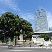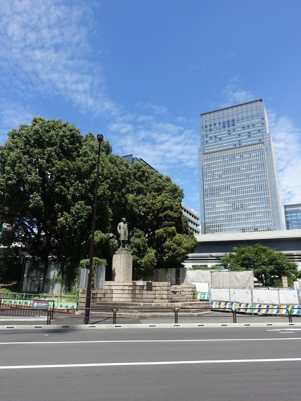 日本銀行のそば、東日本大震災の影響で、修復工事を行っていた常磐橋の西詰近くに銅像が立っています。工事もほとんど終わり、橋は渡れるようになっていました。周囲にあった、工事用のフェンスなども外れ、日銀まで真っすぐの橋が再開して、渋沢さんもほっとしているところではと思います。