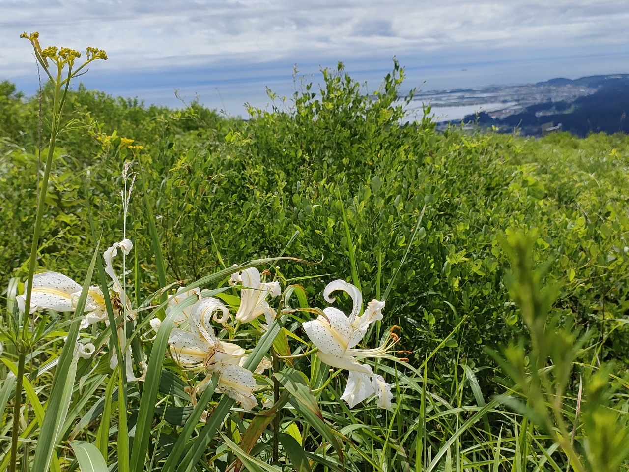 ヤマユリと言えば、山形の羽黒山の道路沿いで見かけた雰囲気から、森林脇の日当たりの良い草むらに生えていそうな感じがしましたが、寒風山では脇本側の麓から木々に囲まれた道を登ってくると、森の途切れる寒風山食堂を過ぎた辺りから、意外にもカンカン照りの草原中に花を見かけるようになりました。
