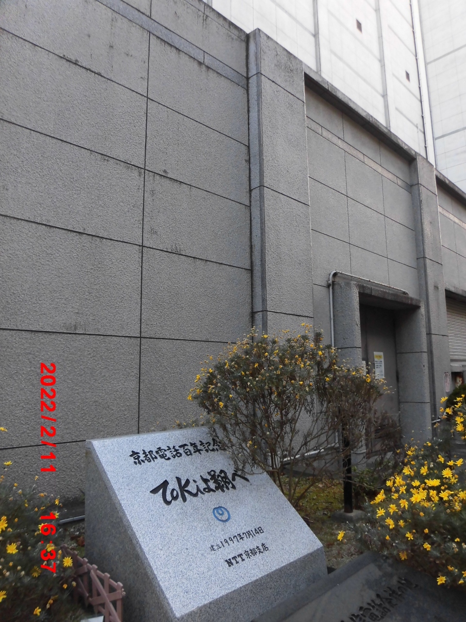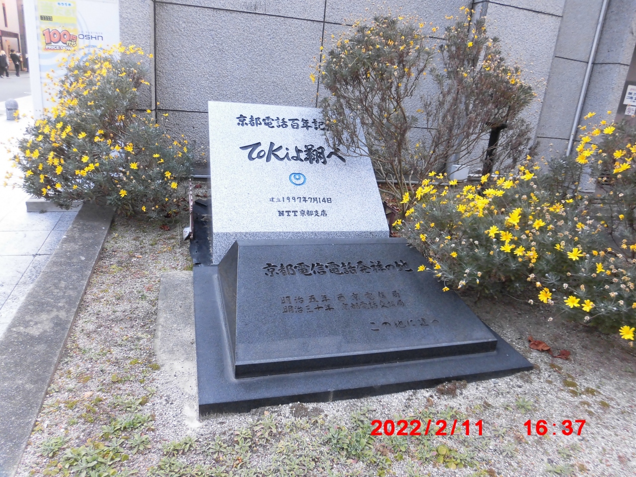 京都市観光で立ち寄りました。京都電信100年記念碑は、西日本電信電話株式会社京都支店が、1997年に実施した京都電話100周年記念事業の一環として、電話事業を伝えるために数々の品物を収納したタイムカプセルを入れた場所だそうです。説明板がないので、詳しいことは分かりませんでした。