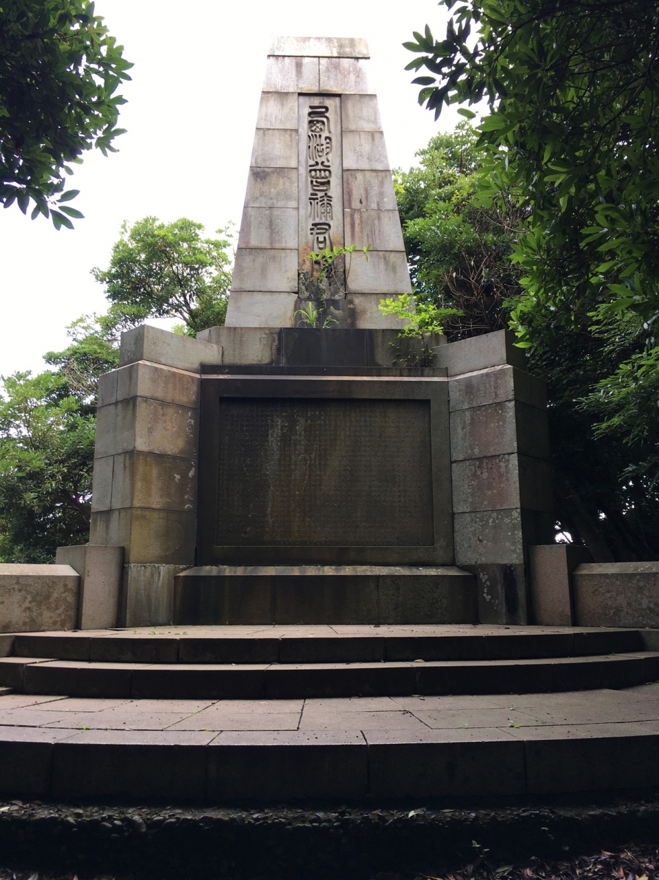 小田急江ノ島線「片瀬江ノ島駅」から徒歩で25分ほどです。「龍野ヶ岡自然の森」内の「龍恋の鐘」の北側にあります。大きな顕彰碑です。日露戦争時に大蔵大臣を務めた政治家で長州出身で伊藤内閣の司法相でもありました。彼が逝去した際、別荘が片瀬にあったため、時の首相によって、この地に建てられたそうです。森の中なのでほとんど訪れる人はおりませんでした。
