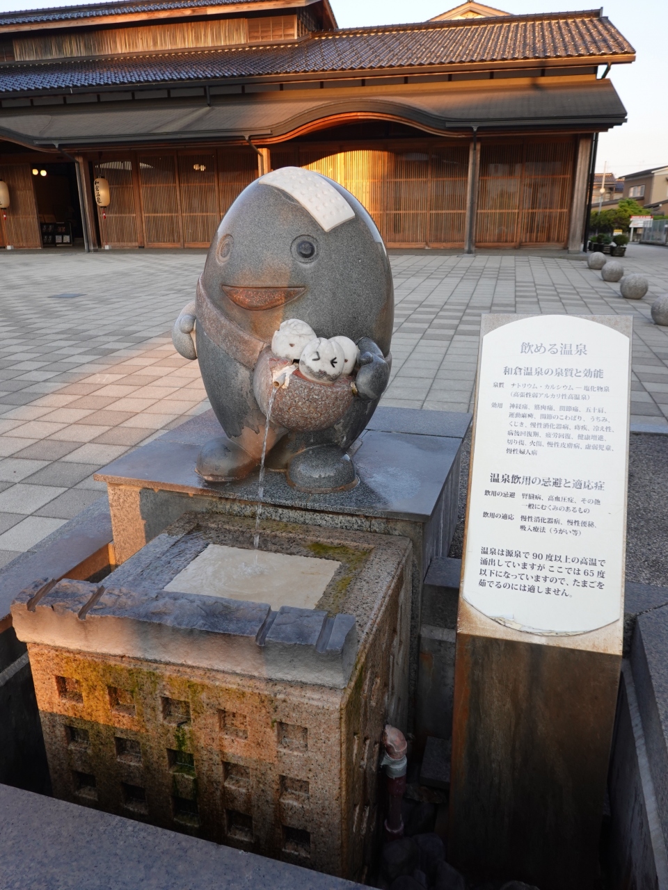 和倉温泉に宿泊した際、夕食前に温泉街を散策しました。和倉温泉総湯は、手ごろな料金で日帰り入浴出来る施設です。建物前には、たまごをモチーフにした可愛いオブジェがあり、泉質などの詳しい案内書きがありました。飲んでも良い温泉というのが興味深く感じました。