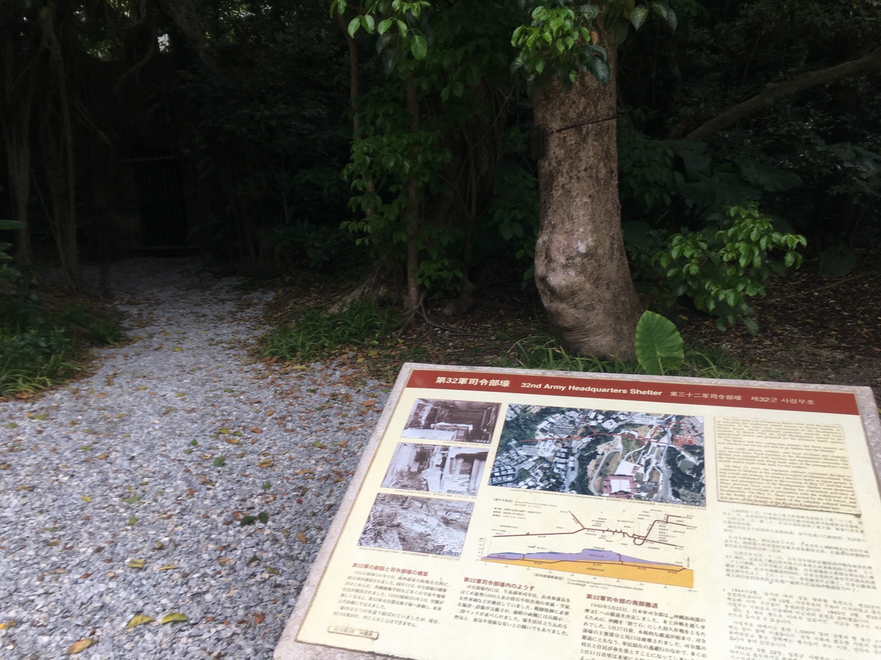 ゆいレール「首里駅」から徒歩で20分ほどです。「円鑑池」の近くの木陰に説明板が立っています。沖縄戦で防衛を担った陸軍沖縄守備隊(第32軍)の司令部の壕の入口があります。首里城の下に南北1km以上にわたって走っていることが説明板の図や写真でわかりました。壕内部には危険であるため入ることはできませんでした。