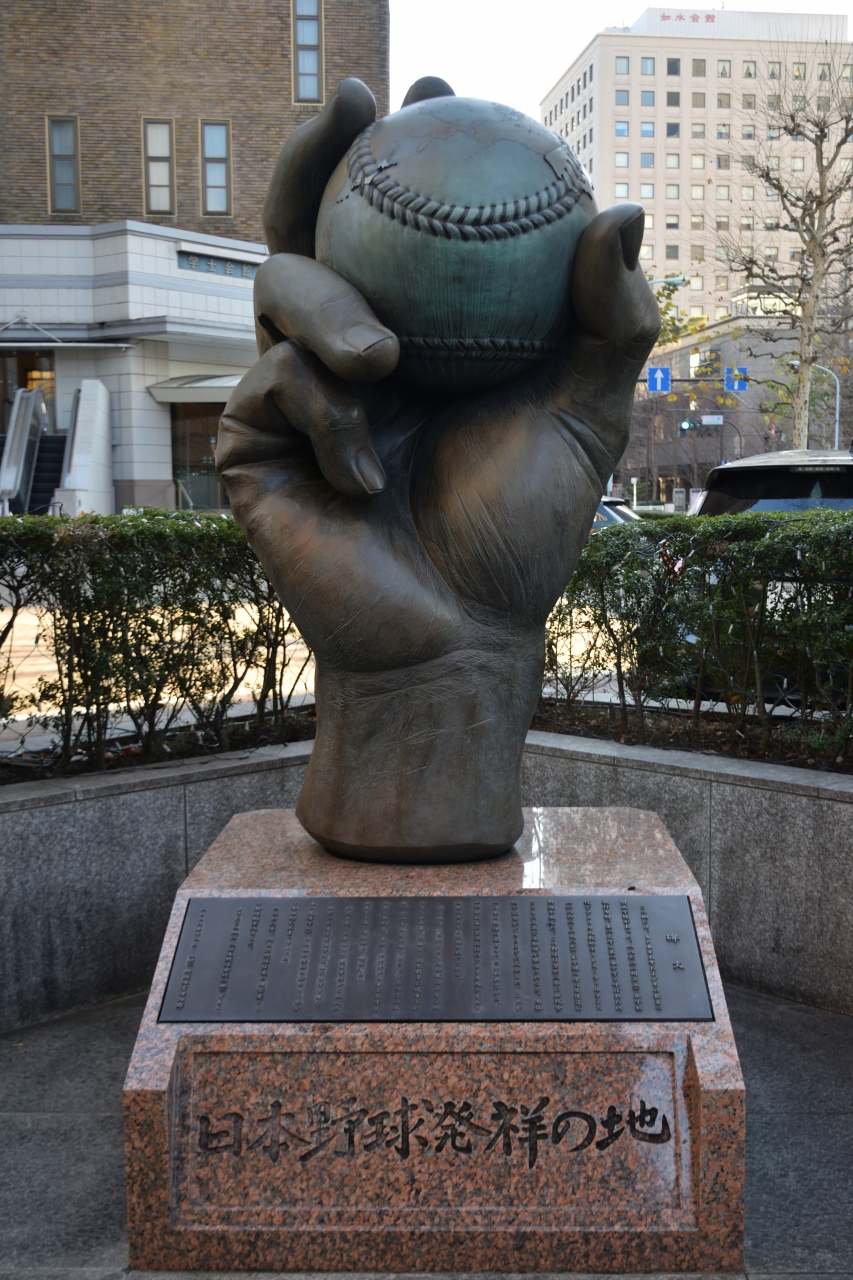 東京大学発祥や、文学のイメージが強い神保町にあるのが日本野球発祥の地の石碑です。ここはかつて米国人教師が日本人に初めて野球を指導したことを記念する石碑です。一目で野球とわかるように野球ボールを握った手の石碑がおいてあります。