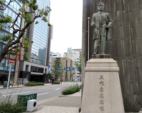 マイドームおおさかの南隣に大阪商工会議所の建物があります。その左脇に商工会議所ゆかりの三人の人物の像が並んでいました。五代友厚像はそのいちばん左側です。大阪取引所の前にある像は有名ですが、もう1か所、別の場所にも像があり、今回出会った五代像は3か所めです。