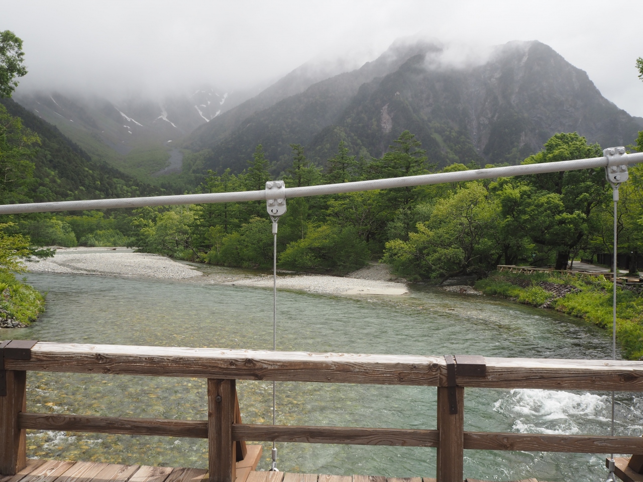穂高岳は飛騨山脈にある標高3190メートルの奥穂高岳を主峰とする山々です。上高地からも梓川などの視界が開けた場所からは穂高岳はよく見えますが、残念ながら訪れた日は前日から1日中雨の天気であって、当日は雲が山の中腹から山頂に残り穂高の全景は見れませんでした。