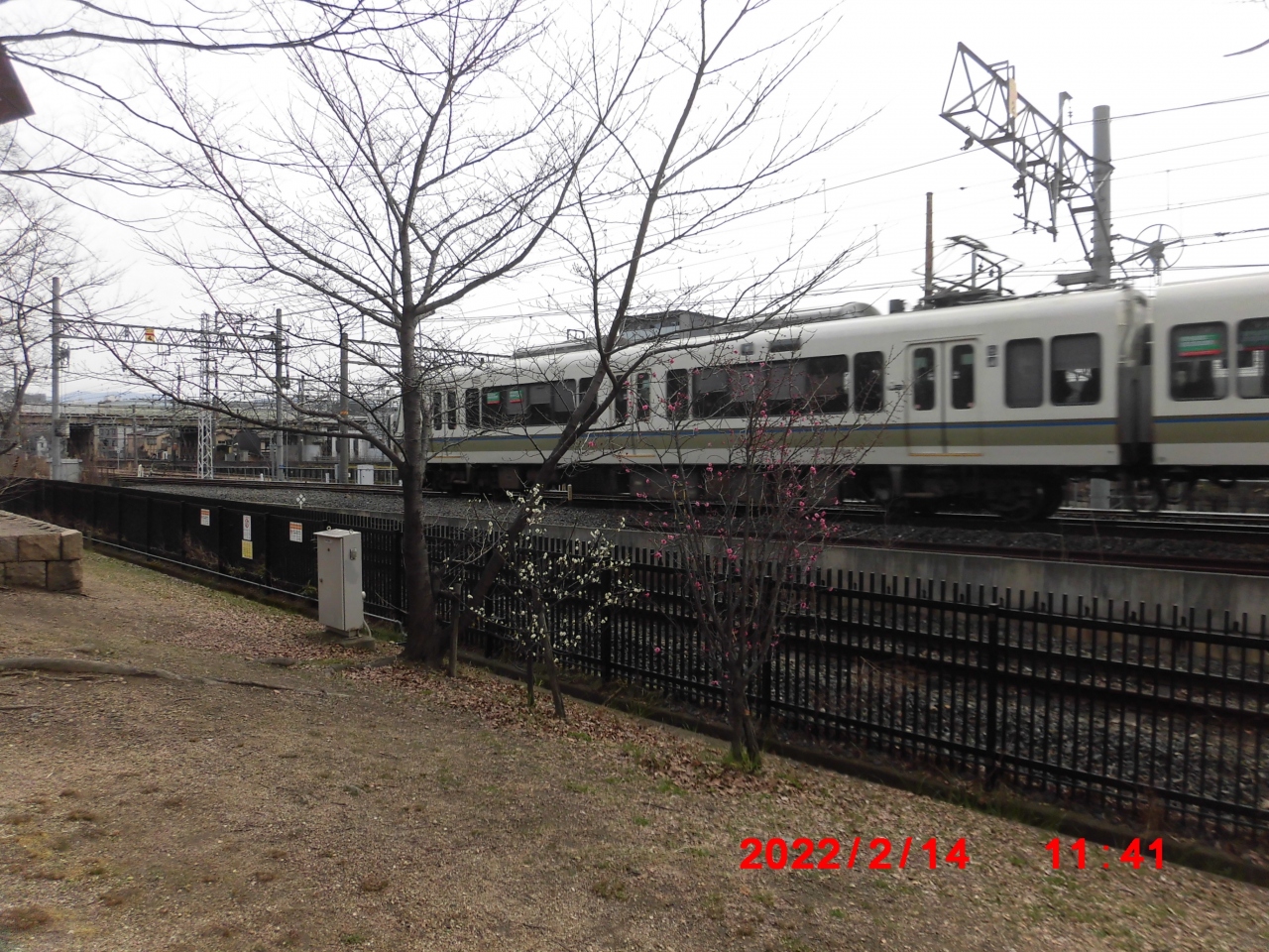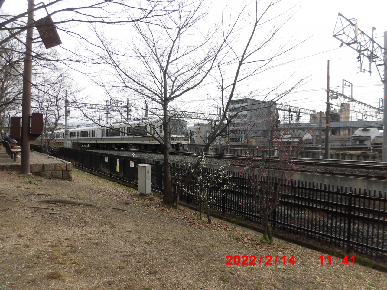 京都市観光で立ち寄りました。京都水族館などがある緑地エリアに梅小路公園があり、公園の南側に4つの鉄道線(嵯峨野線、山陽本線、京都線、新幹線)を見ることが出来ます。うまく電車が通るまで待つほどではないので、運が良ければと思って少し待って見たら、JR山陽本線の列車を見ることが出来ました。