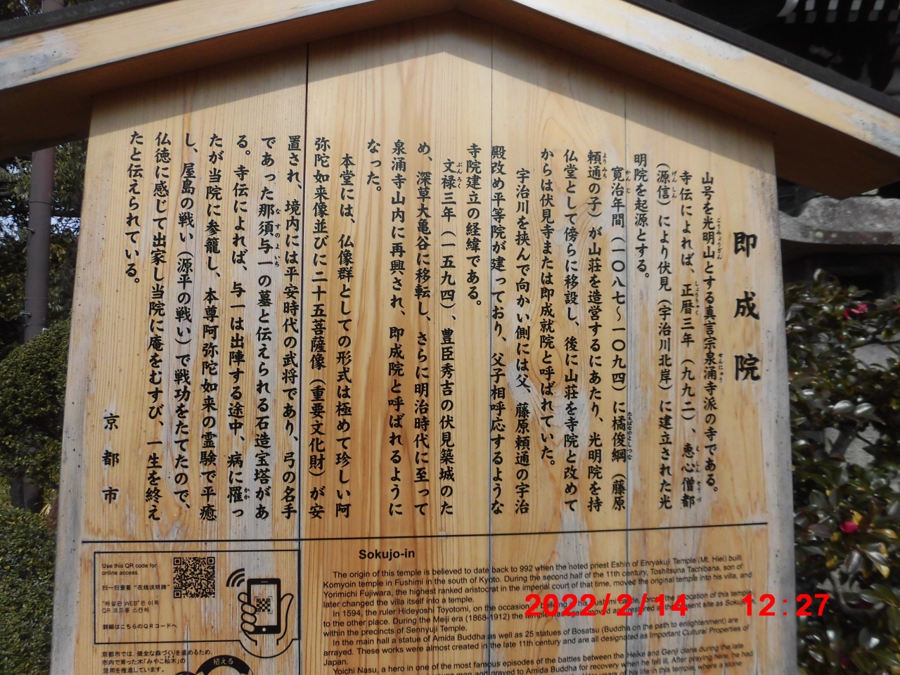 京都市観光で立ち寄りました。光明山「即成院」は、東福寺駅から東に徒歩10分ほどの距離にある真言宗泉涌寺派の寺院で、総本山泉涌寺の塔頭の一つです。11世紀後半に藤原頼通の子橘俊綱が創建し、明治に現在地に移転したそうで、弓の名手である那須与一ゆかりの寺として知られていると説明板に書かれていました。