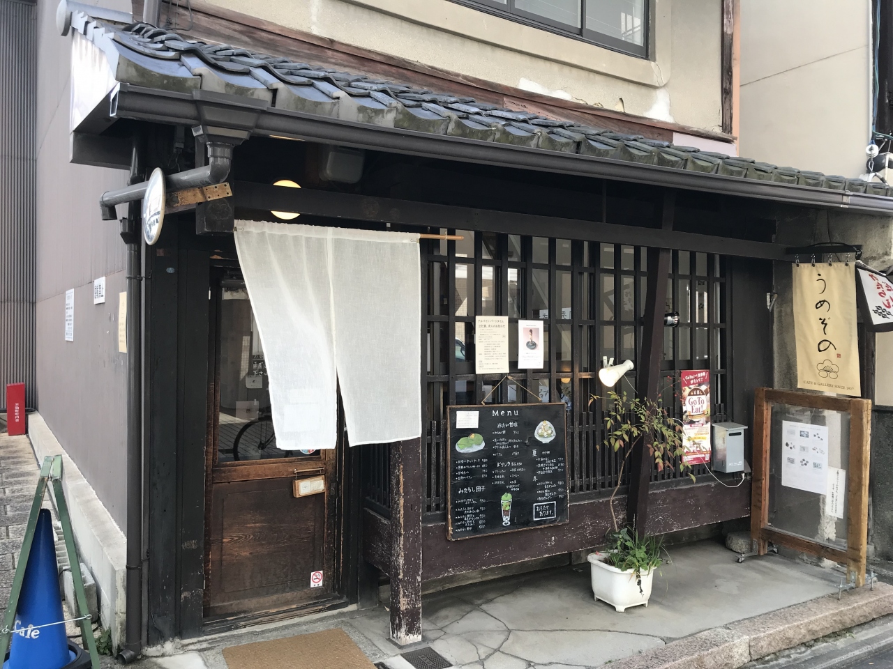 うめぞの カフェアンドギャラリーは、地下鉄「四条駅」から北西の方向へ徒歩8分くらいの場所にあります。京都の老舗 甘味処 梅園さんの支店です。古民家をリノベーションされた店内は、手前に雑貨を並べてギャラリー風になっています。うめぞのさんはみたらしだんごなどで有名ですが、抹茶のパンケーキを頂きました。トッピングはこし餡と黒糖バター。ボリュームがあり、ふわふわで美味しかったです。京都を訪れた際には必ず立ち寄りたいお店です。