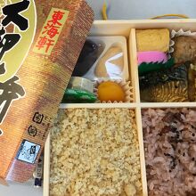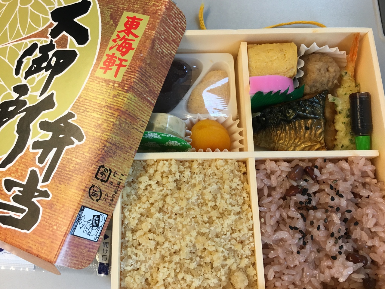 静岡駅構内にある駅弁の老舗です。朝早くから夜遅くまで、品切れもほとんどなく営業しています。久しぶりに定番のひとつ、大御所弁当をいただきました。徳川家康ゆかりの地で、葵の御紋のパッケージです。鯛めしと赤飯が入っています。