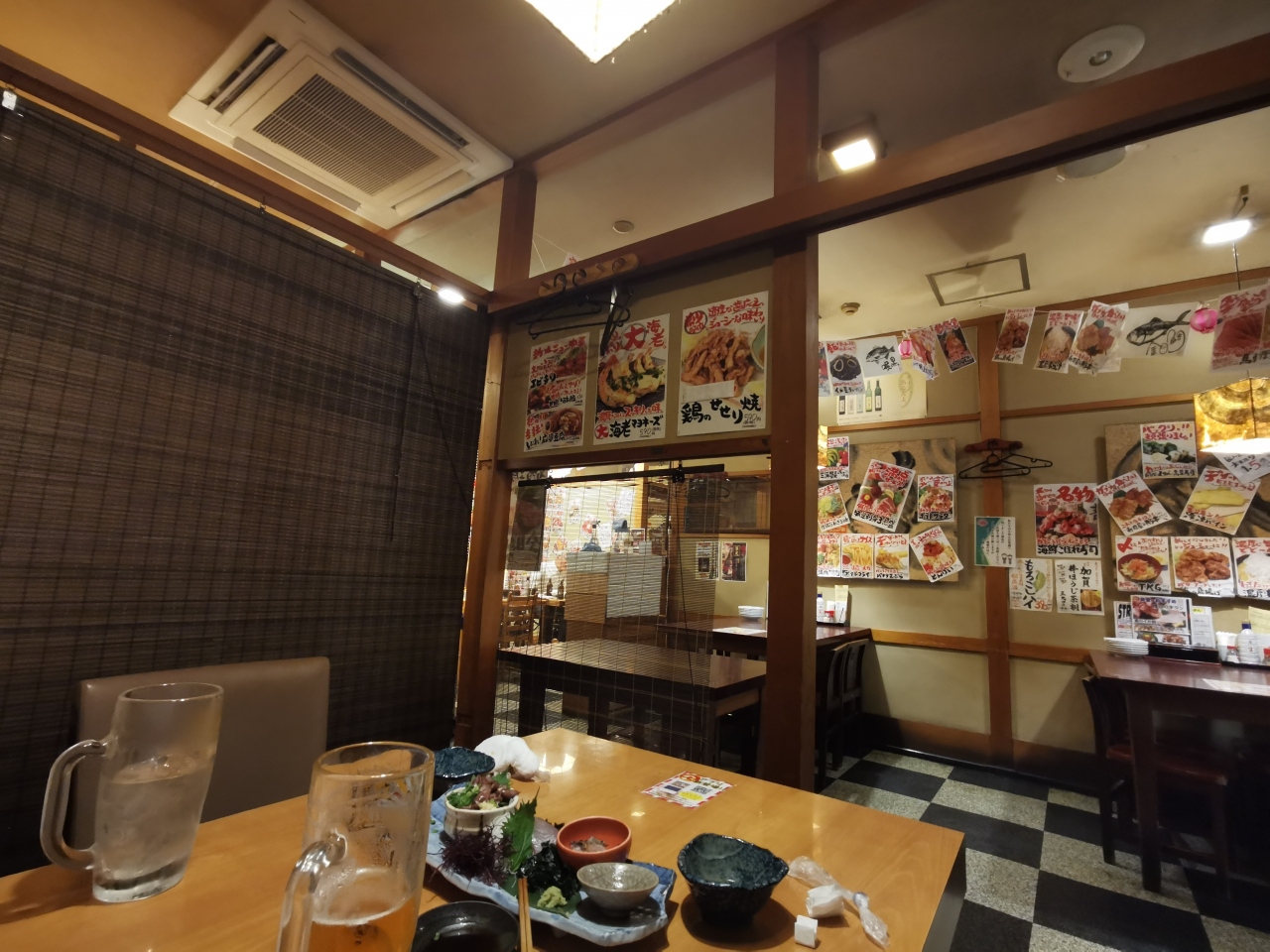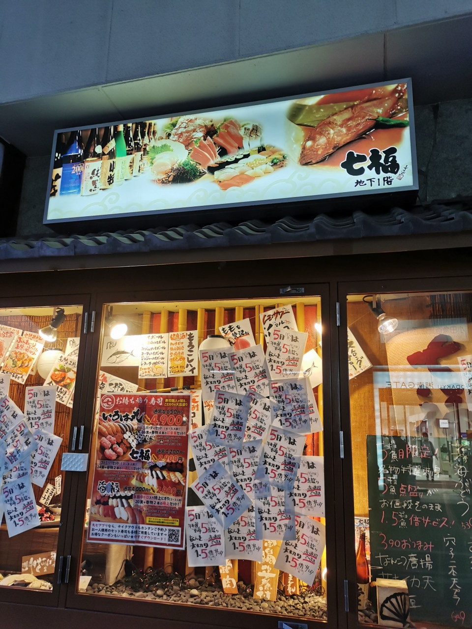 江ノ電ビルの地下1Fの「酒菜食彩 七福 藤沢店」で友人と昼飲み。真っ昼間からお酒飲める店は貴重です。地下1F。お世辞にも綺麗ではないが雰囲気はよい。テーブル席が主。内部に喫煙室もあり。お刺身といろいろ注文。ビールもつまみも早い。おばちゃんも気さくで良い感じ。良い店ですよ。