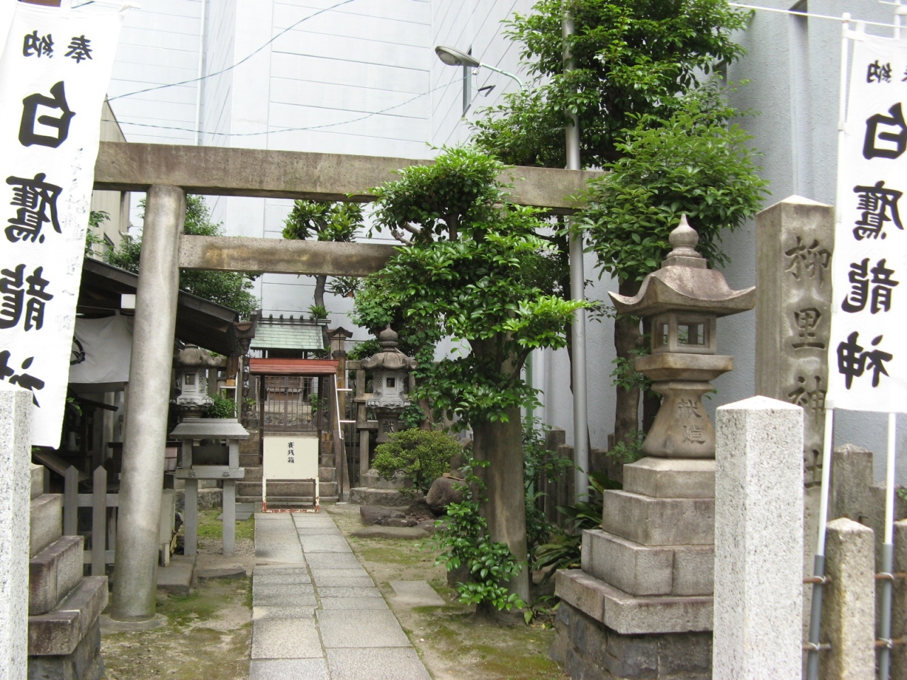 笹島の交差点からすぐのところに鎮座されています。参道入り口右手に「柳里神社」と彫られた大きな石標があるのですが、周りには白鷹龍神と書かれた白い幟がたくさん目立ちます。神社の由来書きが見当たらず歴史などが判りませんでした。ビルの谷間に鎮座する小さな神社で拝殿も小さく、歴史を感じるような雰囲気は無かったです。