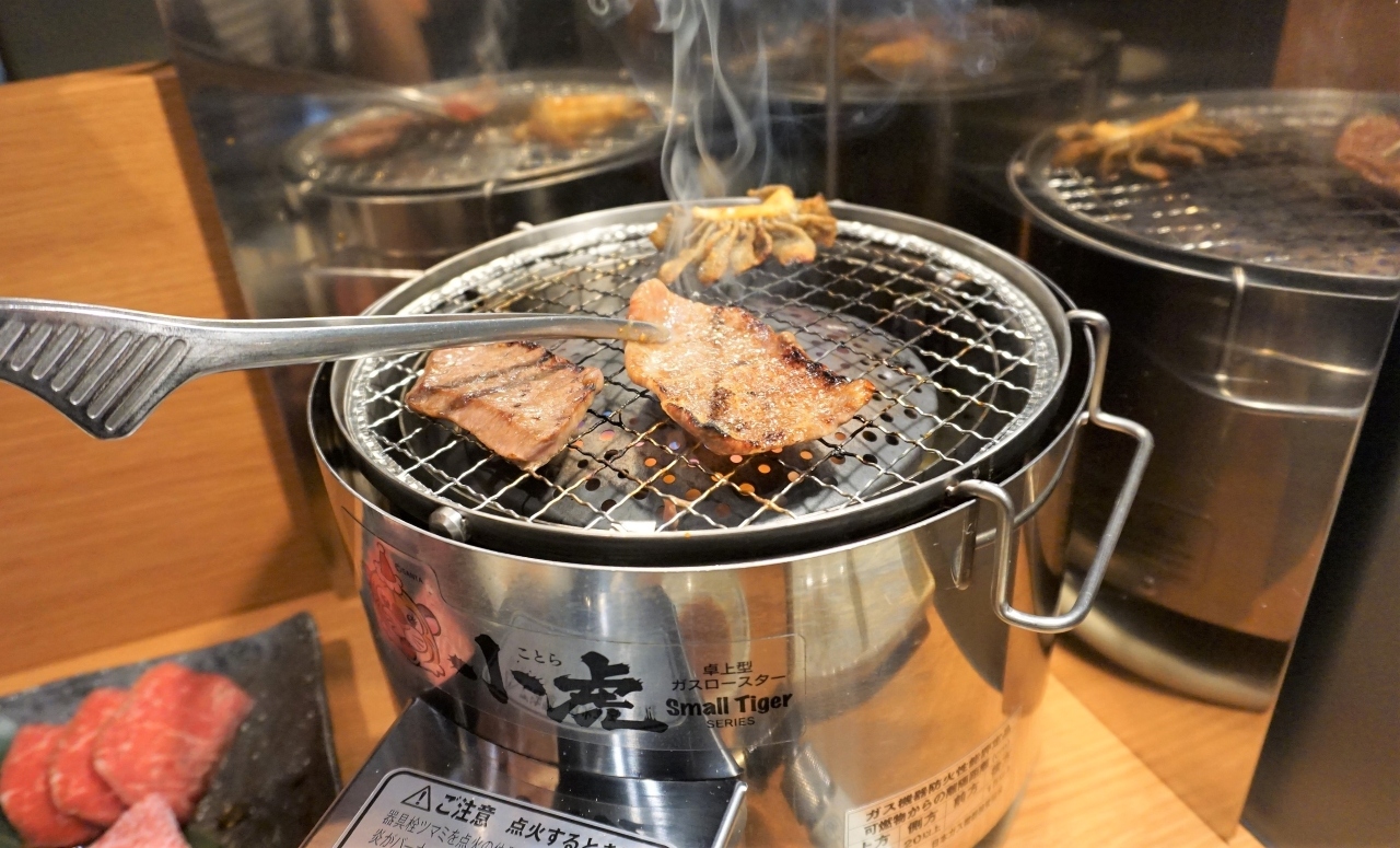 石垣牛【R】ソロコンボ(2,442円)を注文、カルビ・ロース・タン塩など色々食べられます。ロースターで自分のペースで焼いて食べられるのが◎。
