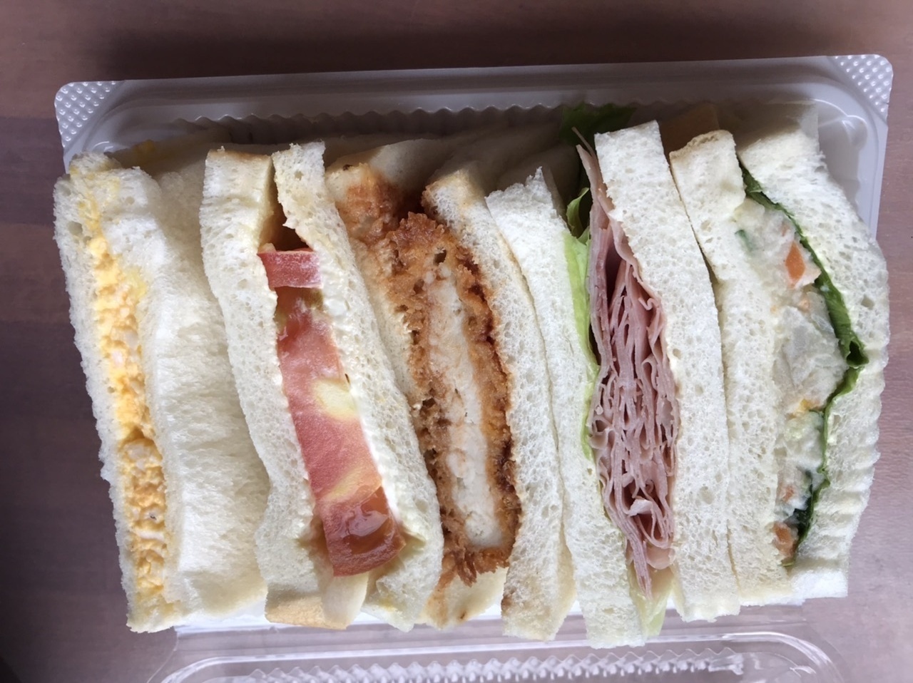 午後六時ごろ、日光駅からの特急で食べる夕ご飯を、と思ったら駅の売店はしまってらいて周りにもお土産屋さんしかない!どうするか、とおもってJR日光駅方面に歩いていたら出会ったパン屋さん。地元のパン屋さん、という風情で、美味しそうな調理パンもあるなか、ミックスサンドを購入。たまご、トマト、ハム、カツ、ポテトサラダの5種。お陰でひもじくならずに済んだ。