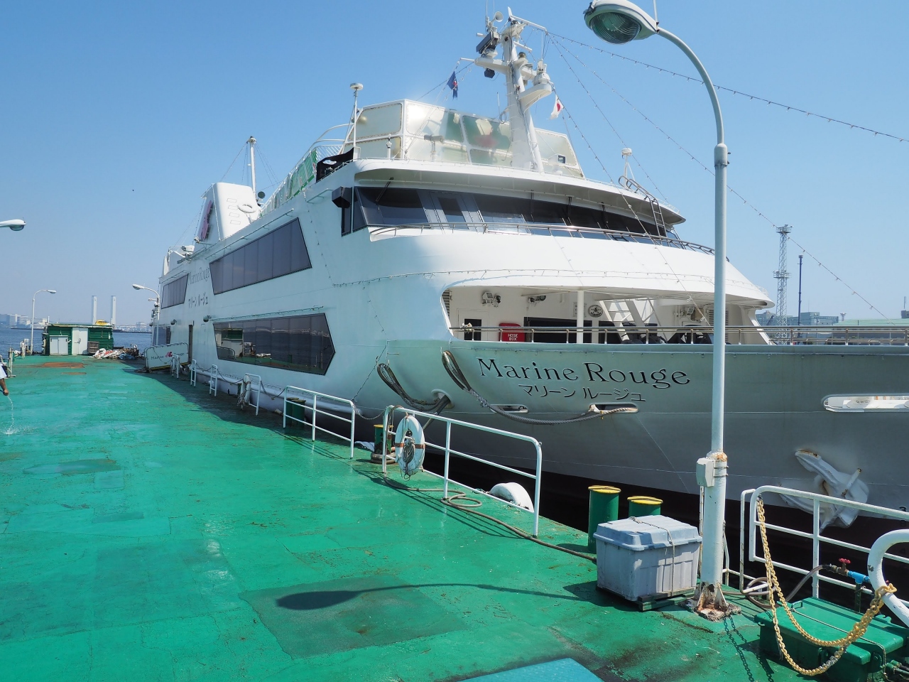 横浜の山下公園の桟橋から出向するクルーズ船。