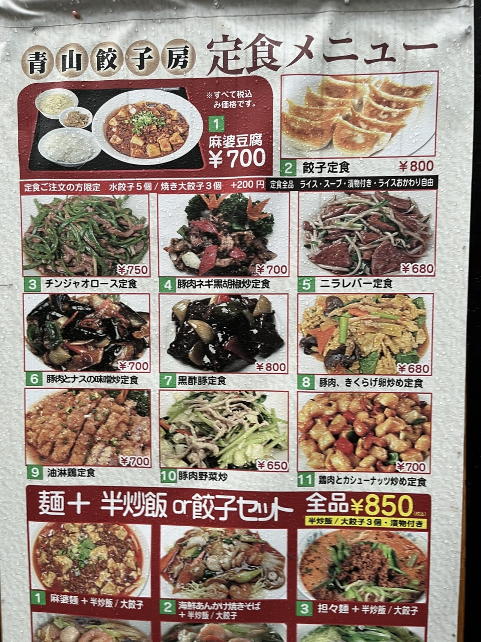 「西武池袋線 大泉学園駅」の北口から 数分のところにある こちらのお店【 青山餃子房 】「麻婆豆腐」「餃子定食」「チンジャオロース定食」など…男性が好きそうな 定食メニューが いろいろあります。店頭には テイクアウトのお料理が並び、ベルを鳴らして 店内のスタッフに 知らせます。