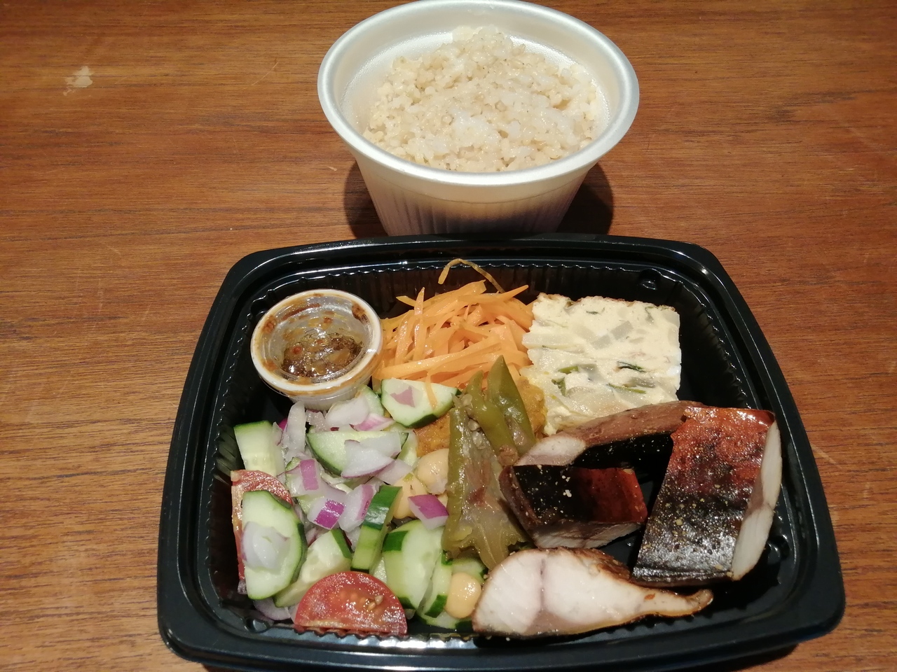 惣菜店と名がついていますが、実体はおしゃれでヘルシーなお惣菜で一杯やれるバル的なお店です。もちろんテイクアウトもOK。なのでランチボックスをテイクアウト。主菜は5種類の中から「さばのスモーク」をチョイス(季節や日によって変わると思います)。お値段820円。ご飯は付いていないのでプラス110円で玄米ご飯を付けました。