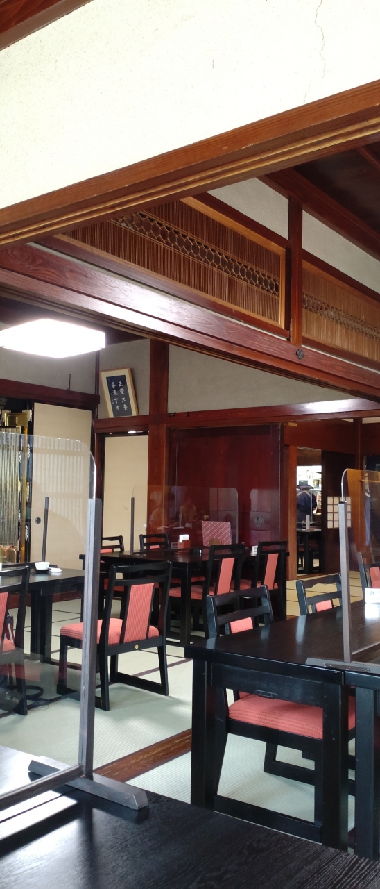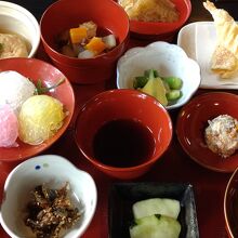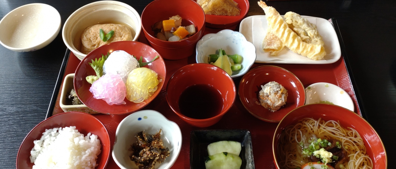 散居村で有名な砺波平野の 田んぼが広がるのどかな風景の中にあります。伝統家屋「アズマダチ家屋」を改装したレストランです。古民家の建築を楽しみながら「伝承料理」をいただきました。こちら特産の大門素麺をはじめ、「ゆべす」「よごし」「具入り丸揚げ」「根菜いとこ煮」など、昔のハレの日に食べたであろう郷土料理です。なつかしさを感じました。