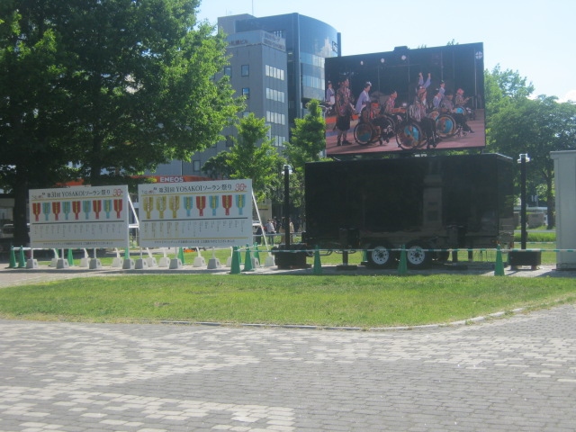 有料席も3年ぶりに設置されていましたが、それ以外にも10丁目会場に大型モニターが設置されて、無料で見物できるようになっていたり、地下にもYOSAKOIブースが設置されていたりと、観客が一か所に集中しないように配慮されている感がありました。