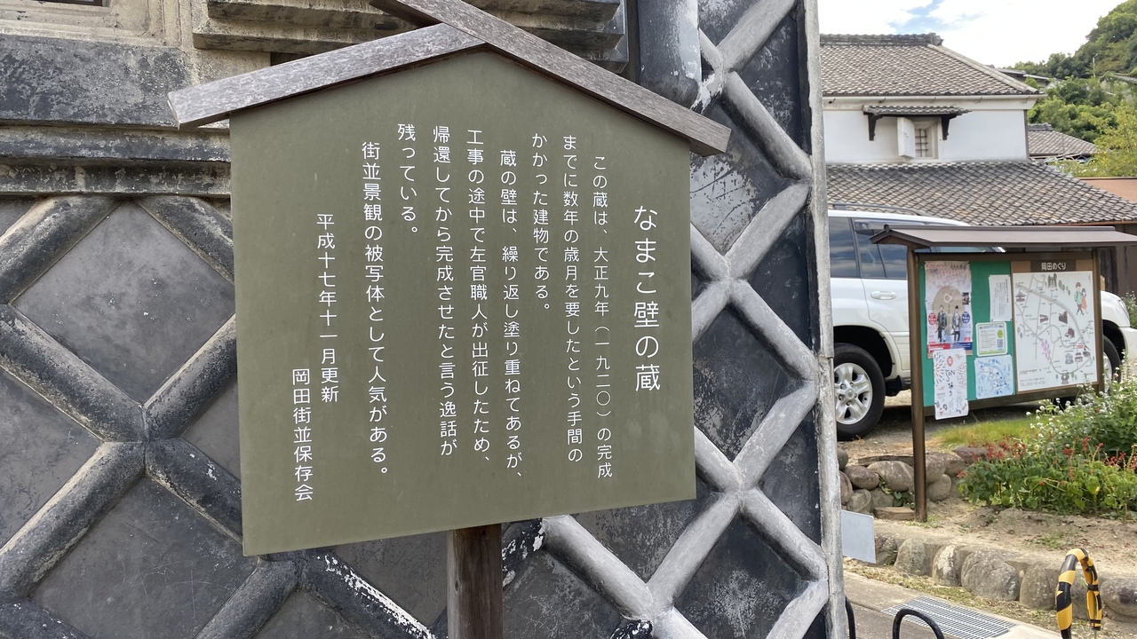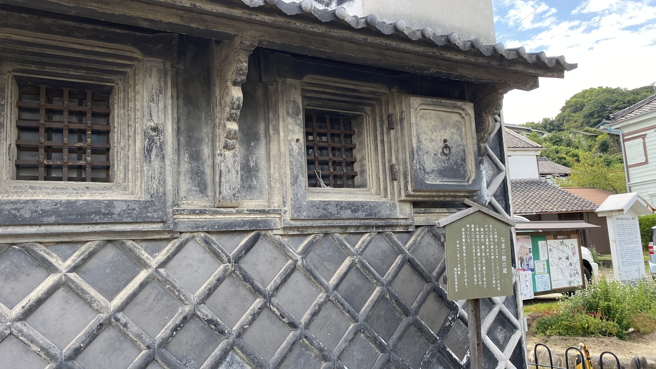 知多産業道路の長浦インターから車で約10分の所にあります。おかき屋辰心の近くにあります。街並みは細い道で住民が住んでいる古い建物が並んでいます。土蔵は他にも残っており、街並みの入り口にこのなまこ壁の蔵はあります。
