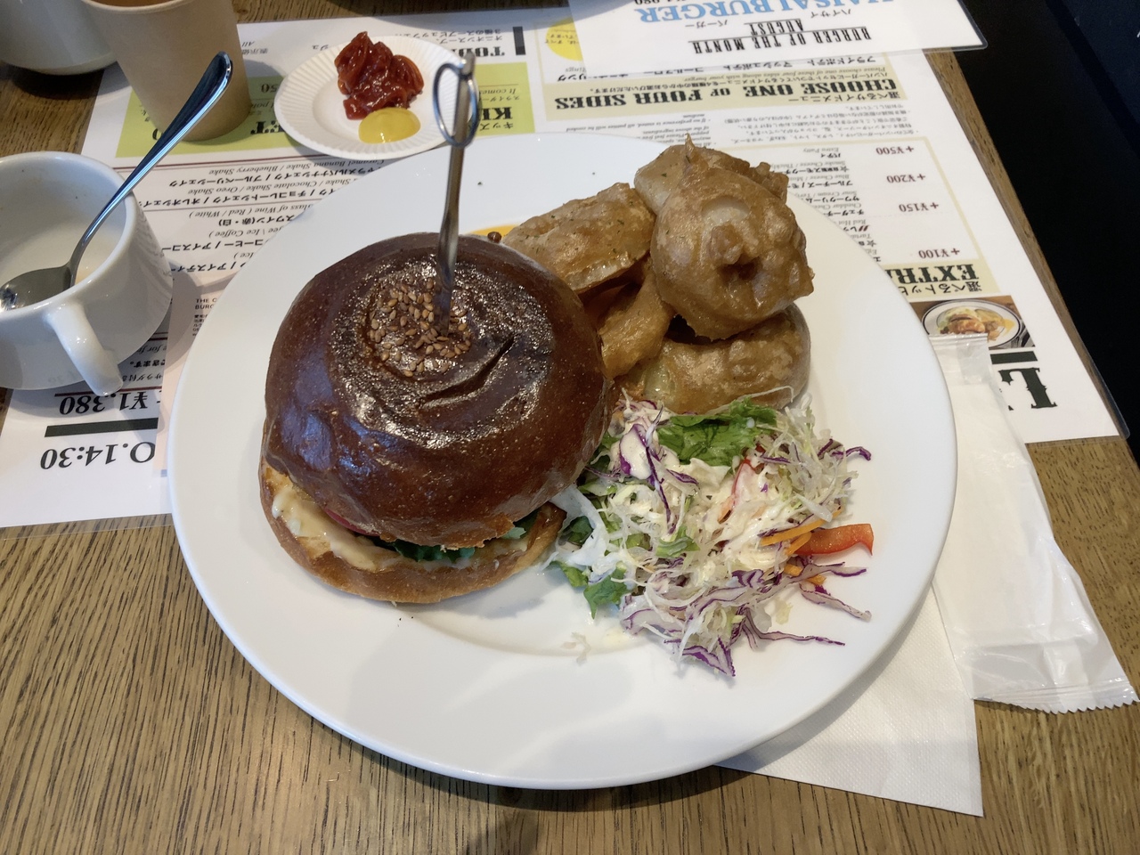 休日のランチ、映画を観る前に利用しました。ランチセットは3種類のスープが飲み放題、サイドメニューもポテト、オニオンリング、コールスロー等から選ぶ事が出来るお値打ちなランチです。もちろんハンバーガーにも追加料理でチーズ等のトッピングを追加出来ます。ハンバーガーは非常にジューシーで美味しかったです。