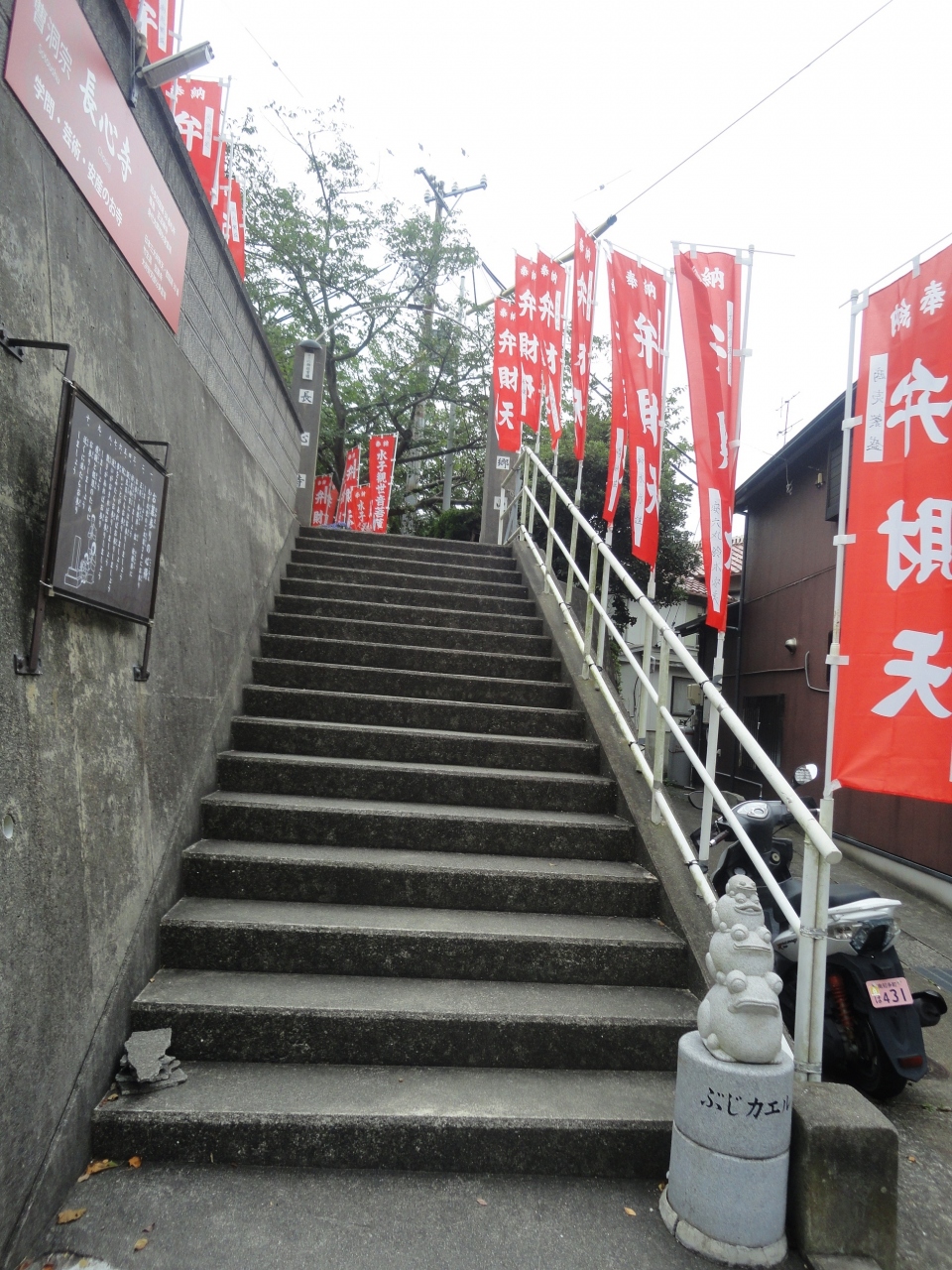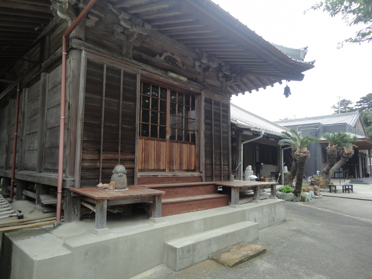 日間賀島の西港から細い路地を進み、坂道を上がったところで見つけたお寺です。「ぶじカエル」と書かれたカエルの置物の階段を上がると、お寺の境内でした。境内のいろんな場所に可愛らしい置物がおいてあったので、たくさん写真を撮ってしまいました。境内はさほど広くはなく、お堂もこじんまりしていましたが、楽しめました。
