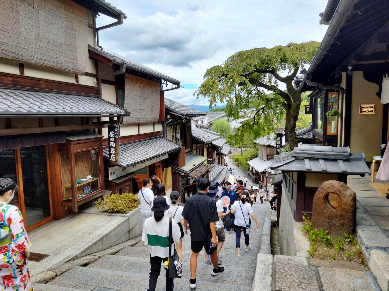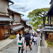 豊臣秀吉の正妻のねねが子供の誕生を念じて坂をあがり、清水寺にお参りしていたことから産寧坂の名がついたとされる坂で清水寺に通じる坂のひとつ。