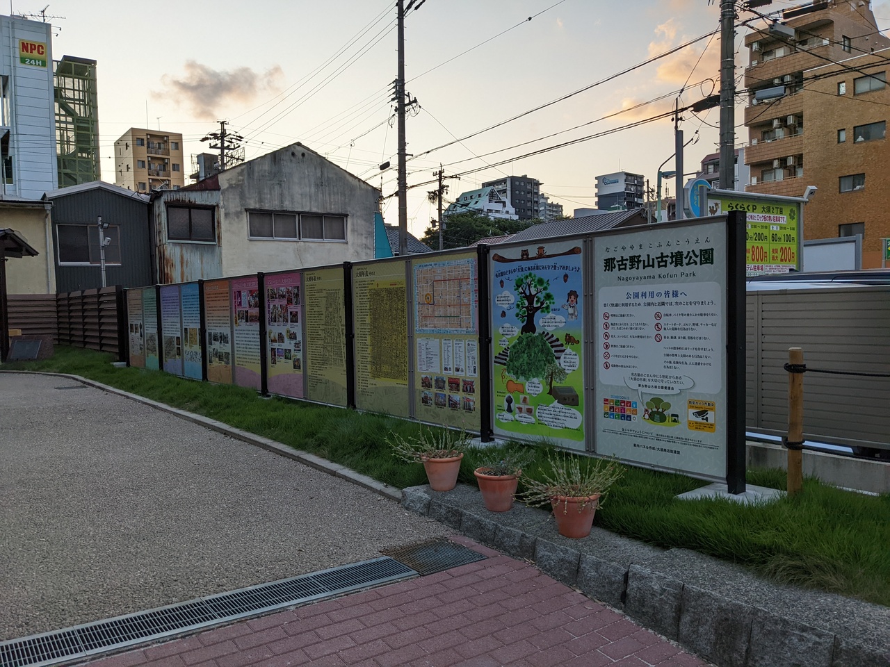 大須商店街にある古墳が「那古野古墳」です。那古野古墳は、5世紀中頃に造られた前方後円墳と推定されている古墳で、現在は、円墳状の部分のみが残っており、その場所に公園が整備されています。賑やかな大須商店街の通りから少し入ったところにひっそりと佇む古墳なので寂しい雰囲気でした。