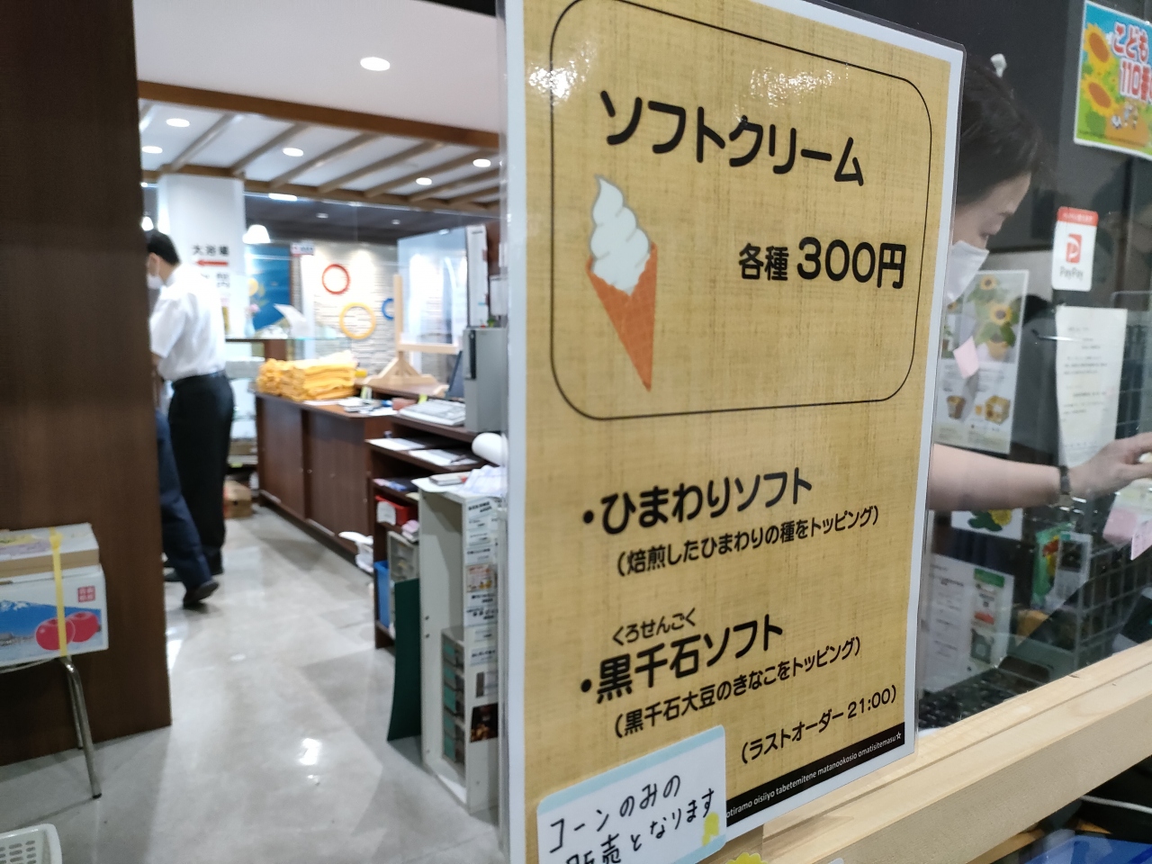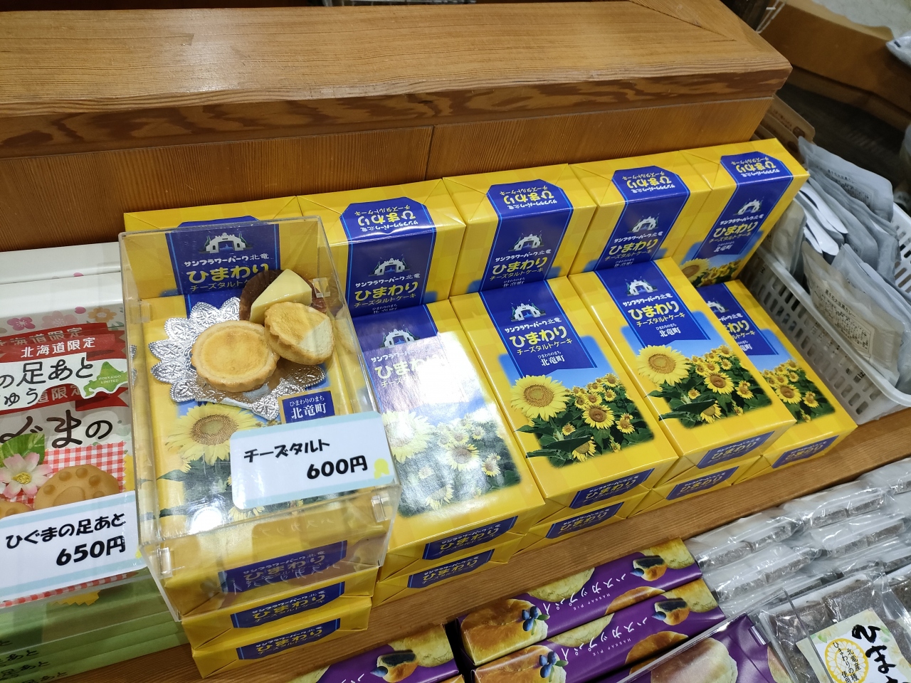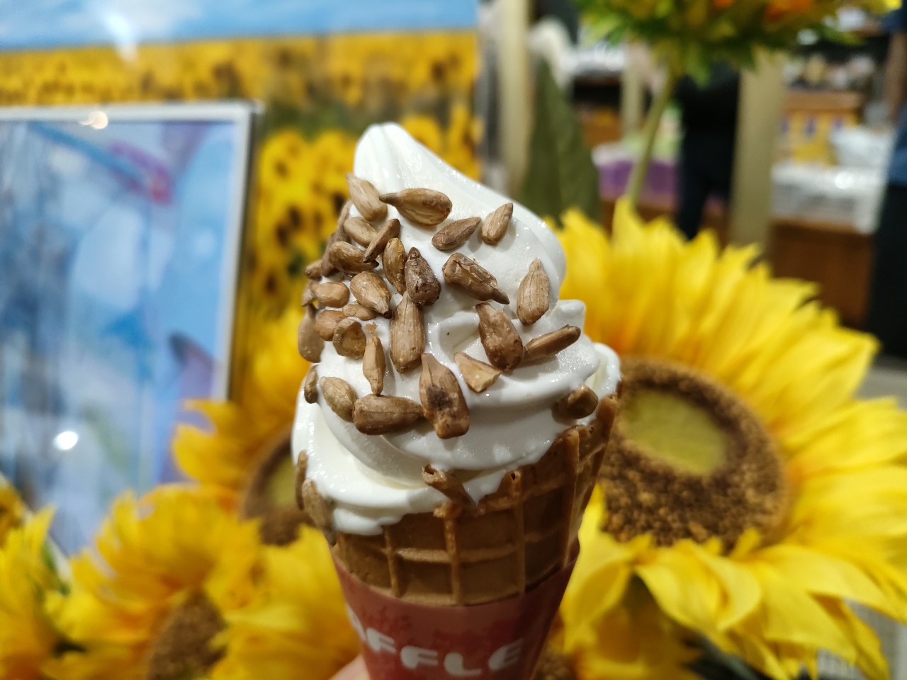 お土産売り場としては、北竜町の観光の目玉、ひまわりにまつわる製品(ひまわり油、ひまわり柄パッケージのチーズタルト、ひまわりデザインの小物など)を売っていたほか、ひまわりソフトクリームが人気でした。ひまわりソフトは、¥300円で焙煎したひまわりの種をトッピングしたというもの。種はナッツのような味でクリームの味とよく合い、ひまわりの里の方で売られていた、ひまわりの種の粉末の入ったひまわりソフトクリーム(¥350円)より美味しい感じでした。