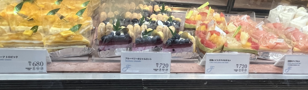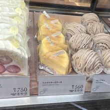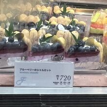 店内ガラスショーケースには 「ブルーベリーのシャルロット」「ベイクドチーズケーキ」「モンブラン」など どれも美味しそうです。