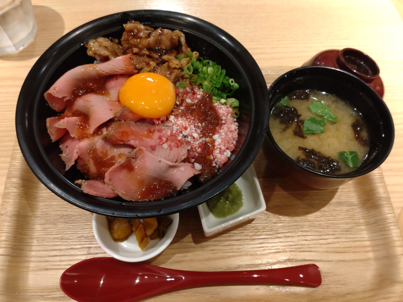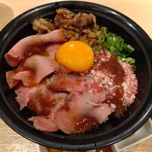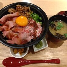 今回は期間限定で割引だった「ローストビーフに北海道産牛カルビと牛とろ」をオーダー。ローストビーフはしっとり柔らかで、甘みがある。ただし、薄切りなので、肉肉しさはなく、上品な味わい。牛とろは、脂が程よくとろける感覚はたまらない。一方で、カルビはやや筋が残り残念。刻みわさびがアクセントになり、脂を包んでくれるので良い(ただし、入れすぎ注意)。1000円台前半で、レベルの高いローストビーフ丼を食べられるのはありがたい。