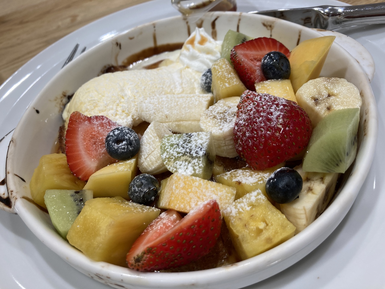 提供された浅皿は、バナナ、イチゴ、マンゴー、パイナップル等が盛られており、フレンチトーストはその下に姿を隠した状態。