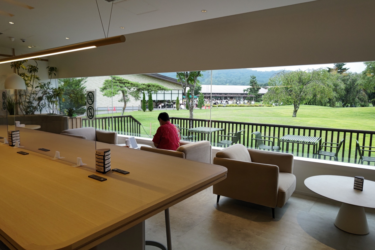 軽井沢プリンスショッピングプラザNWエリアにある、ワーケーション用のスペースで、ノートPCを広げて優雅に仕事をしている人がいれば、僕のように、静かな空間でのラウンジ代わりの時間つぶしや軽食目的に利用する人もいました。