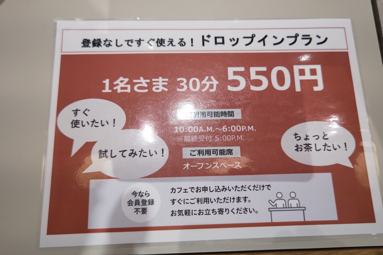 場所代は、会員登録なしの「ドロップインプラン」利用で30分550円、時間内(10時~18時)でしたら、30分刻みで、1時間、1時間半と、スケジュールに合わせた滞在が可能です。