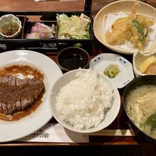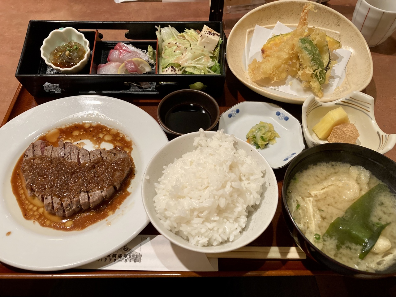 ステーキ御膳のみの残りメニューでしたが、こちらも質と量が素晴らしく、天ぷらも美味しく、刺身まで付いて、1000円というコスパの良さです。