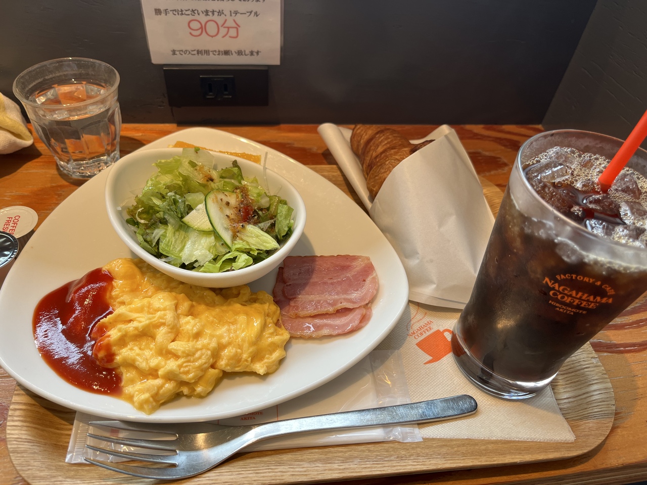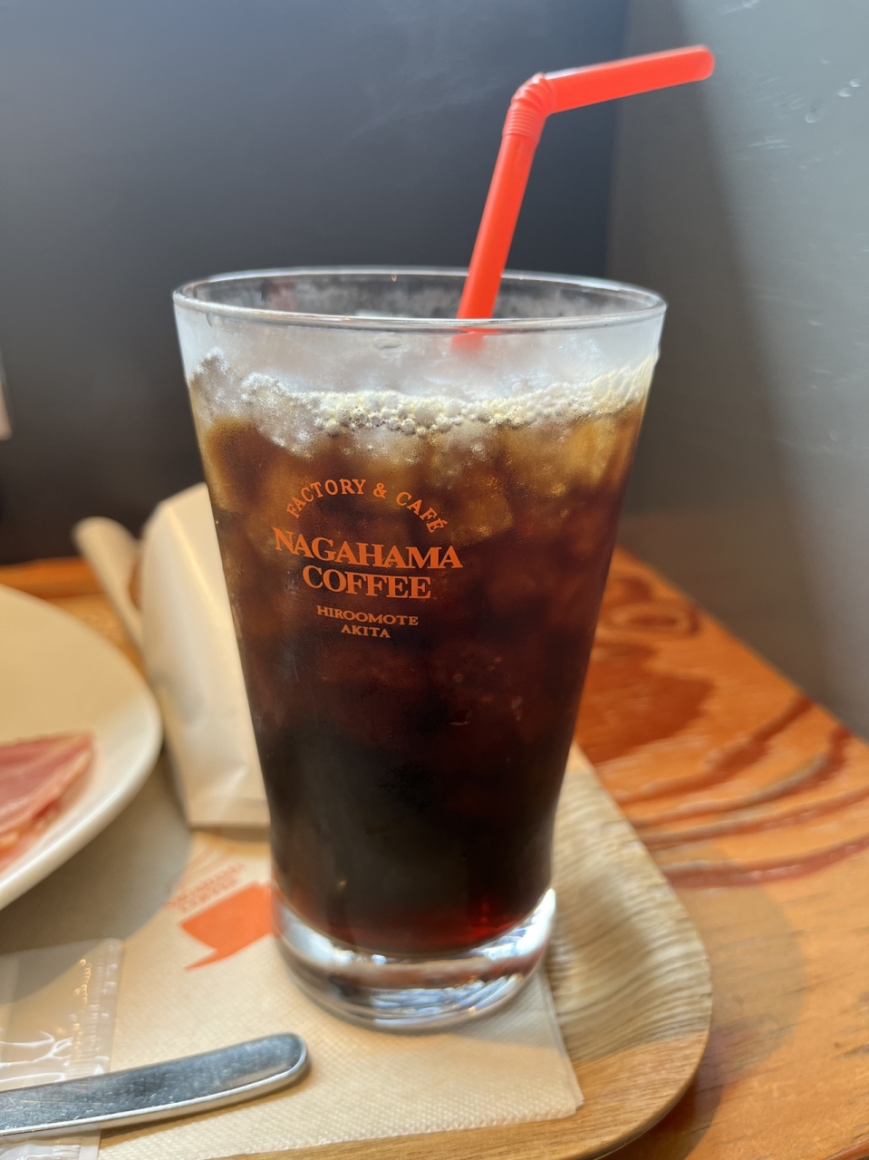 秋田の有名コーヒーチェーン、ナガハマコーヒー唯一の秋田県外店。盛岡駅西口のホテル(ホテルユニゾエクスプレス盛岡)の2階にある(実質上の2階であり、道路に面している)。朝7時から営業しており、モーニングサービスがあるので日曜日のホテルの朝食をパスしこちらでいただくことに。