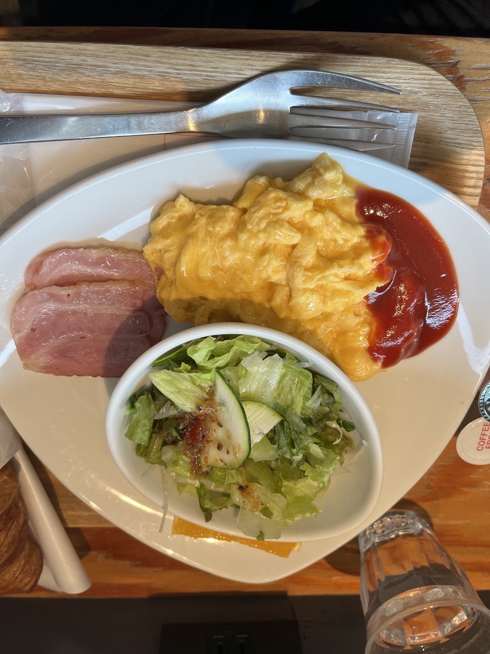 モーニングはクロワッサンまたはトーストをチョイス。ふわふわのスクランブルエッグ、ベーコン、サラダが付いてくる。920円と少々高めだが、お替りチケットが1枚付く(コーヒー、オレンジジュースなどに交換可能)そこで1杯めはアイスコーヒー、2杯めはブレンドをテイクアウトでいただく。