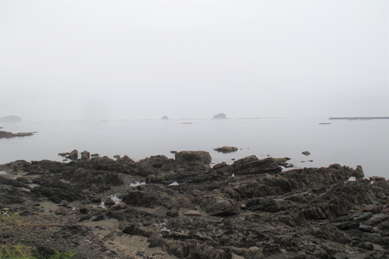 地図を見ると、佐志生の前にある黒島から南に向かって防波堤がいくつか作られ、三ツ子島へと続いていました。景色が良さそうと海岸線の道を進んでみました。この海岸線が下ノ江海岸でした。海岸線ではこれもケスタ地形と呼ぶのかなといったところがほんのちょっとありました。景色として期待した三ツ子島はちょっと距離があって小さくしか見えませんでした。