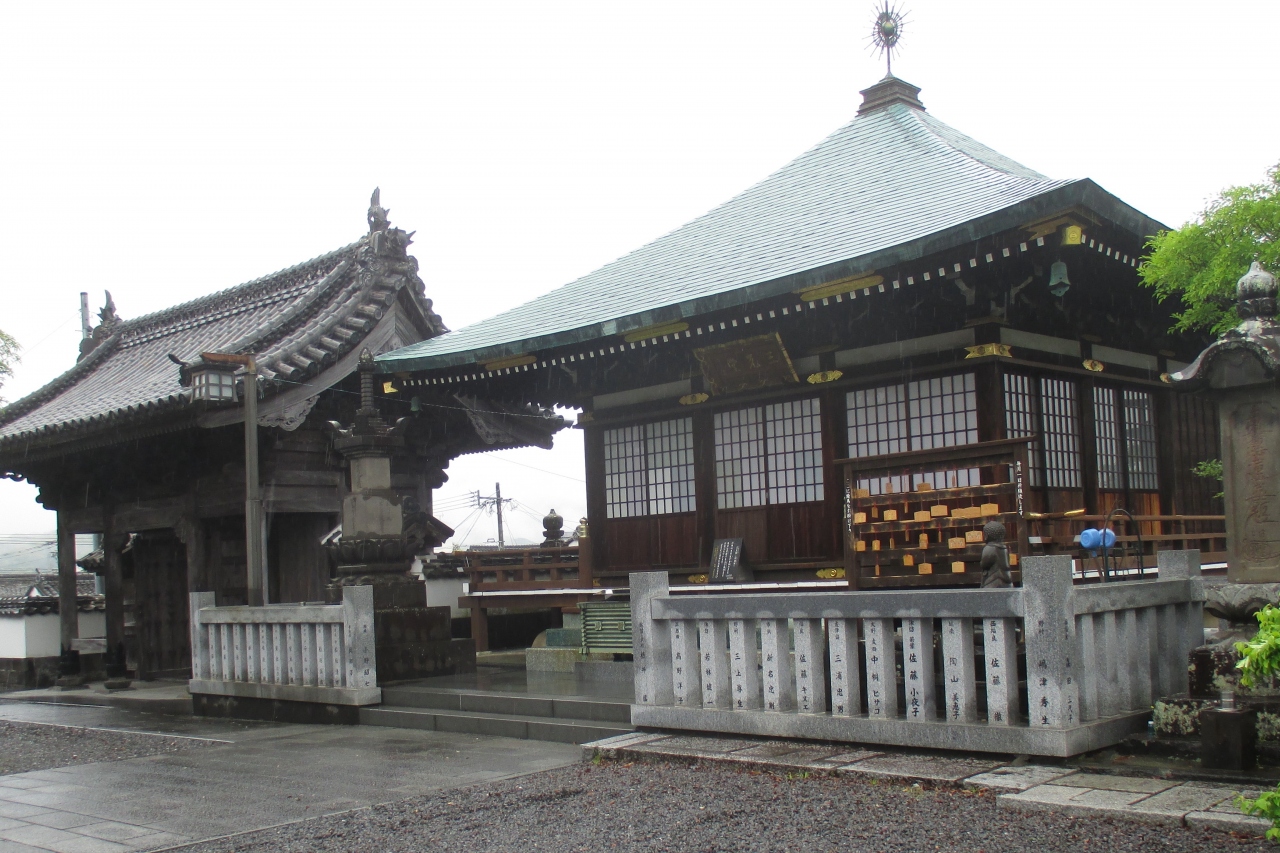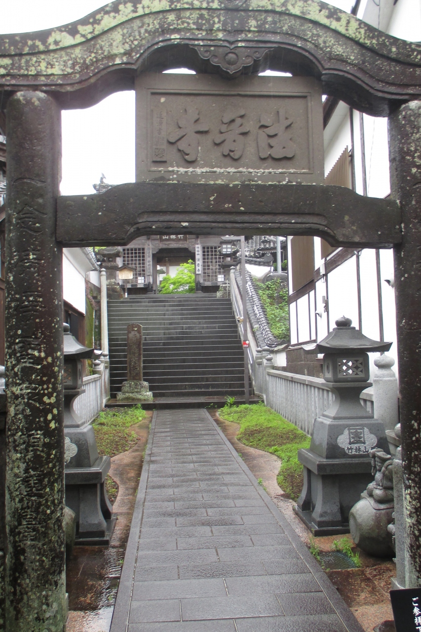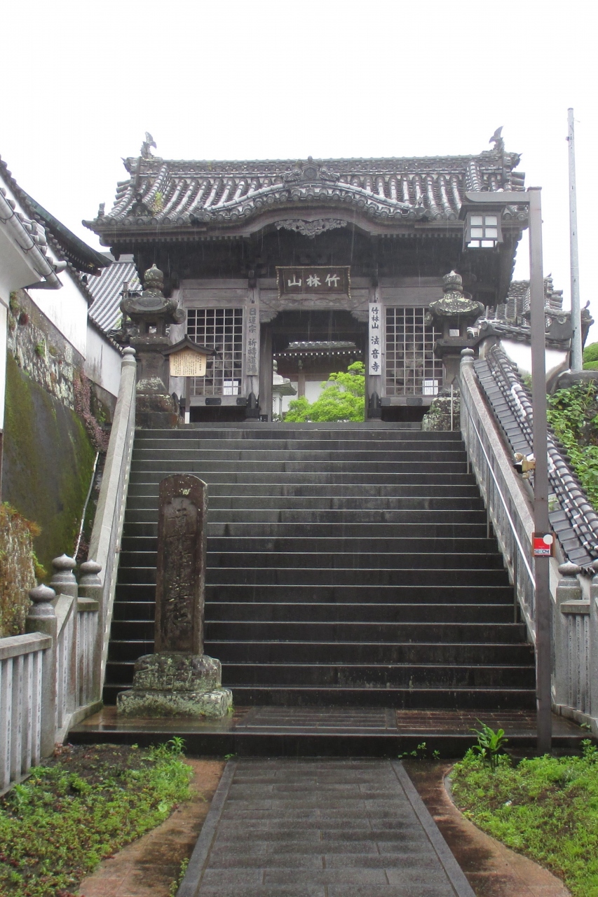 八町大路と二王座歴史の道を結んでいる路地の1つに、法音小道という狭い路地がありました。その二王座歴史の道近くに、鳥居と見紛う形をした法音寺の石造りの山門がありました。1602年(慶長7年)に、後に3代藩主となる稲葉一通が、小倉藩主・細川忠興の姫・多羅(細川ガラシャの3女)を正室に迎えるに当り、その菩提寺として建立され、1642年(寛永19年)に現在地に移転されたものです。(帰依した宗派のお寺がなかったということでしょうか)なお、その時、一通は15歳、多羅は14歳ですから、当時の婚姻適齢期だったのですね。階段を上がったところの二天門の隣に祈祷を行う三光堂がありましたが、この設計者は臼杵出身で、著名な彫刻家でもある日名子実三さんです。サッカー日本代表エンブレムに描かれている八咫烏のデザインをした人としても有名です。なお、山号は竹林山で、日蓮宗のお寺さんです。