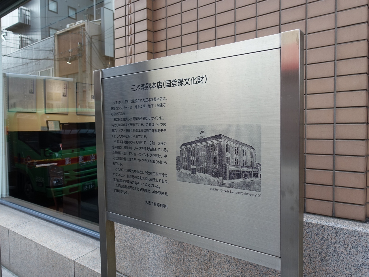 本町駅から6分ほどのところ、心斎橋筋商店街沿いにある楽器店の本社社屋です。日本最古の楽器店といわれる三木楽器が創業100周年の記念として大正14年に建てた建物だそうです。当時、都市部に建てられたショーウインドウ形式の商業ビルの代表作だそうです。