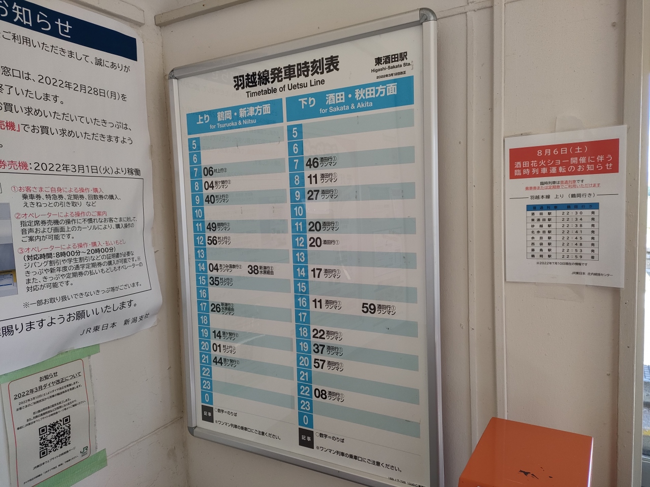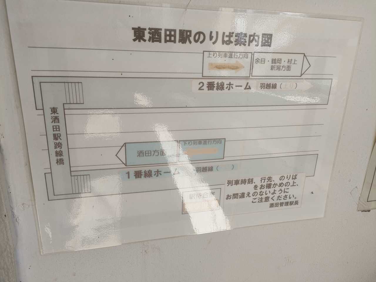 下り酒田方面1番線ホームは、駅舎とつながった単式ホームですが、上り鶴岡・村上・新津方面2番線ホームは島式ホームで、登り降りともそれぞれ31段の階段の跨線橋で渡らねばなりません。エレベーターなどはありません。また、島式ホームは外側が2番線で、内側の下り線と接する側は使われていないので、待つ場所には注意です。都会の人はよく途惑うと思いますが、開く列車のドアが先頭1両目の後ろ側のドアしか開かないことにも注意が必要です。そして、予め駅舎内にある乗車証明書発行機で証明書を発券して受け取っておくことも忘れずに。