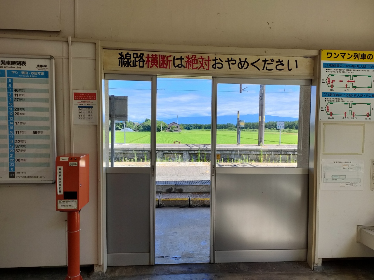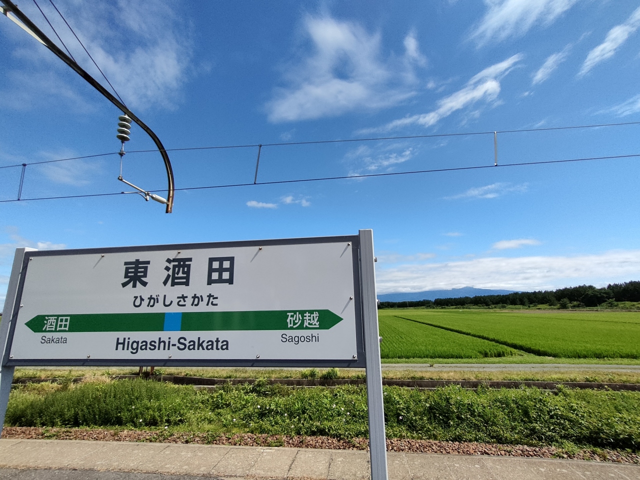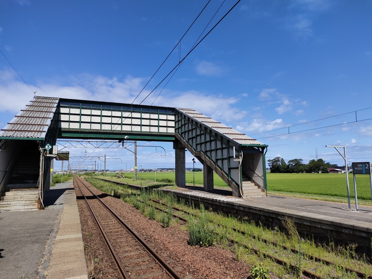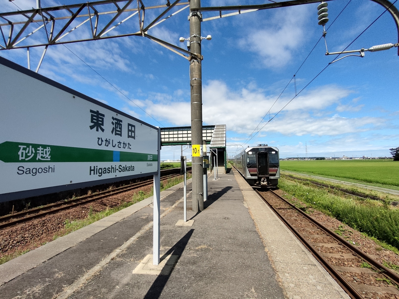 酒田駅から鶴岡・新津方面に1駅隣にある駅で、無人駅です。辺りは田んぼで、駅前に数軒の民家があるくらいです。ホームから眺める田園風景と鳥海山の眺めが長閑で良い駅です。