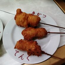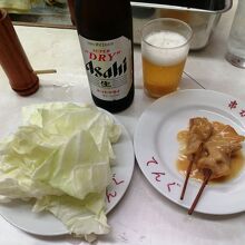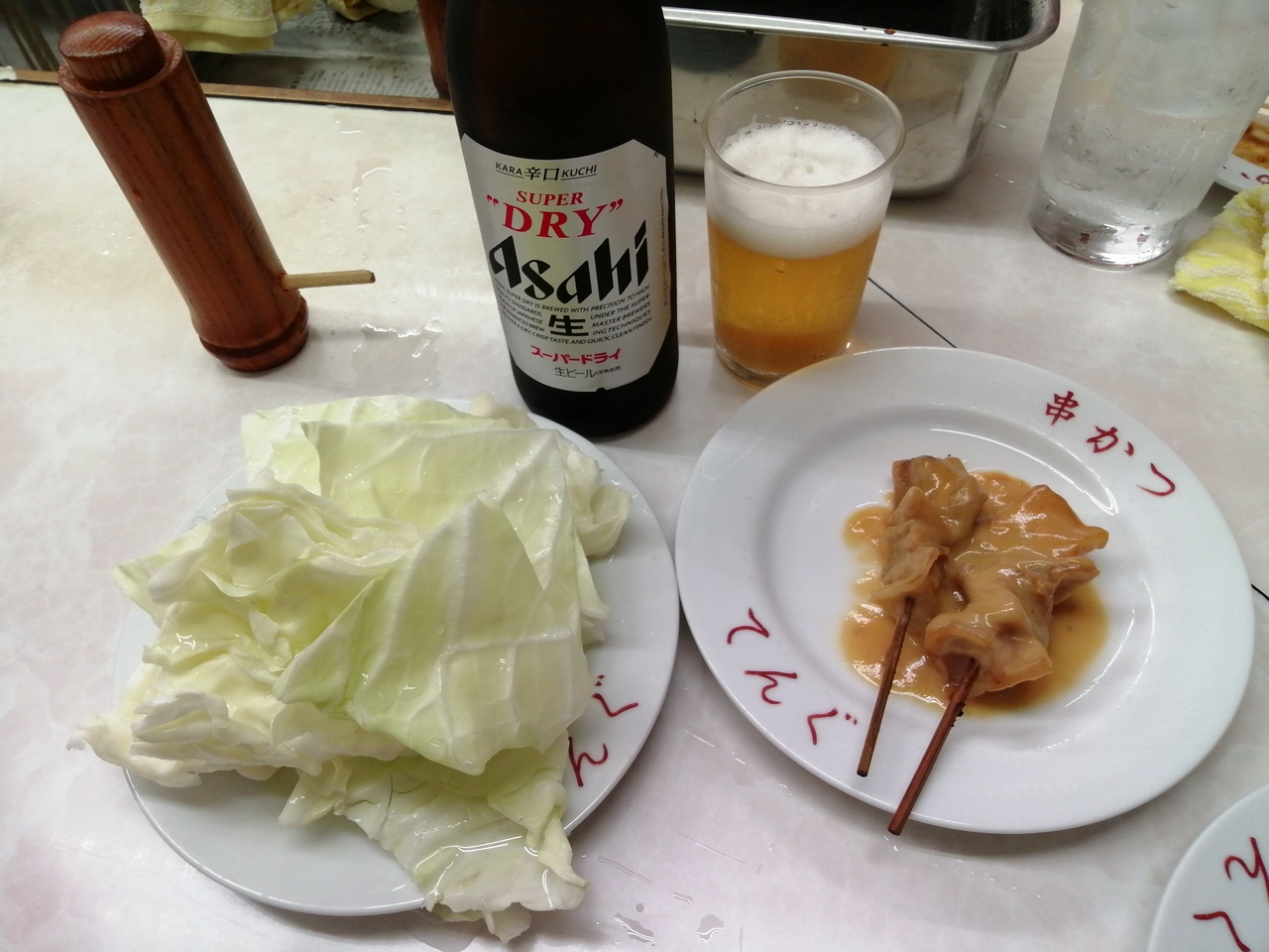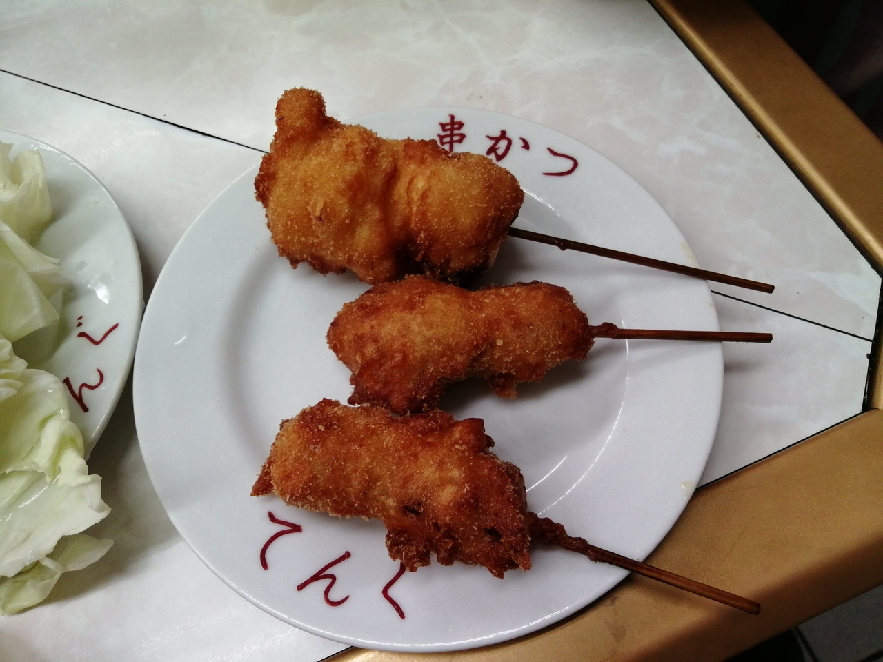 どて焼き2本、串カツ2本、玉ねぎ1本の5本(各110円)を注文。そしてビール小(400円)。まぁうまいですが所詮串カツ、感動はなし。どて焼きは牛すじ、甘めの味噌ダレが独特です。記念に食べたって感じですかね。