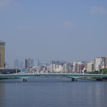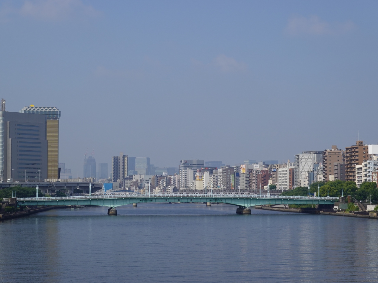 言問橋は、隅田川に架かる橋のひとつで、水戸街道を通す交通の要所です。現在の橋は昭和3年に架けられたもので、両国橋、天満橋と並び三大ゲルバー橋とされています。上流側にある桜橋から見ると、左側に金色に輝くアサヒグループ本社ビルの姿があり、浅草らしい光景を楽しむことが出来ます。