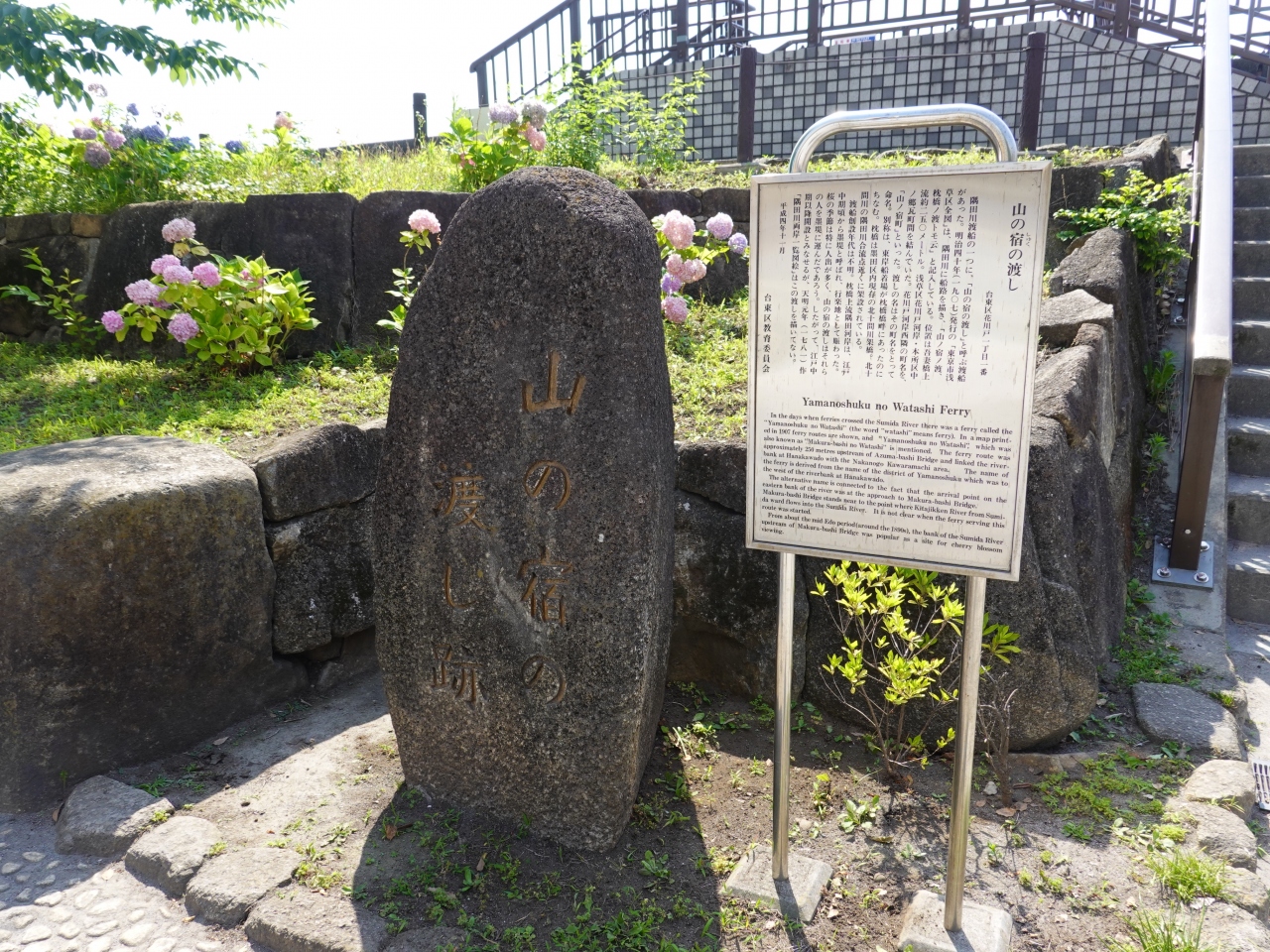 隅田公園の一画、すみだリバーウォークの入口近くに「山の宿の渡し跡」の石碑と案内板があります。現在、隅田川には数多くの橋が架かっていますが、かつては渡し舟がほとんどだったのでしょう、何ヵ所かで「渡し跡」の石碑を見ました。ステンレス製の案内板に文字が刻まれているのみで、往時の光景を偲ぶことが出来ないのが残念でした。