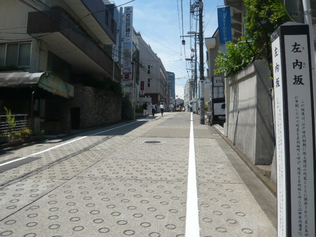 左内坂は、市ヶ谷の外堀から西に進んだ付近にあります。名主の島田佐内が造ったとされます。