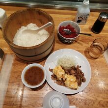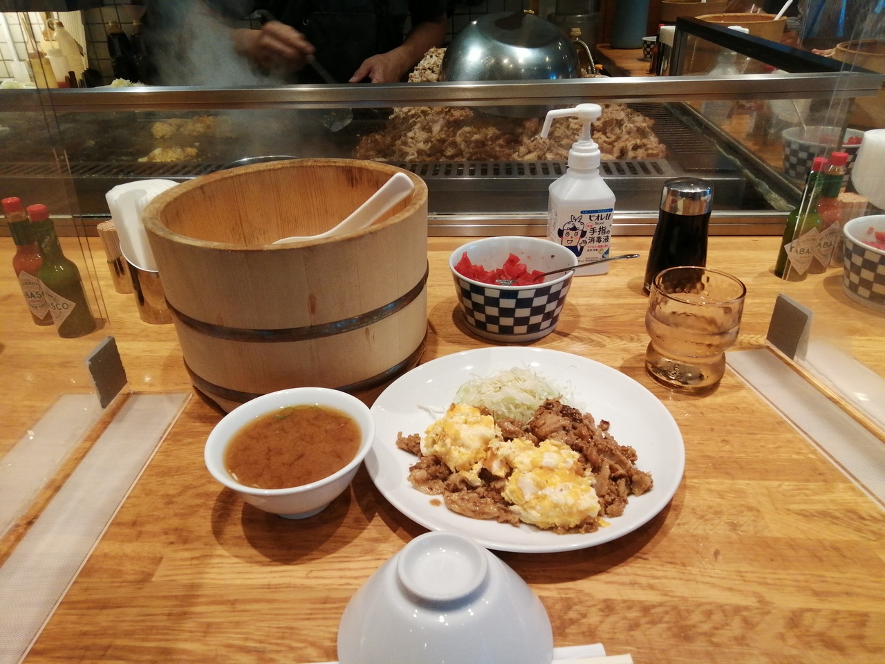 まもなく料理が運ばれてきました。小間切れ豚肉の焼き肉と卵焼き、そしてご飯が“おひつ”で出てきます。お味は…うまーい!やや濃い目の味付けなのでご飯が進みます。福神漬けが置いてあるのもグッド。ちっちゃ目のお茶碗2杯食べてお腹いっぱい。おひつにはまだまだご飯が残っています。全部食べられる人はそうはいないと思います。